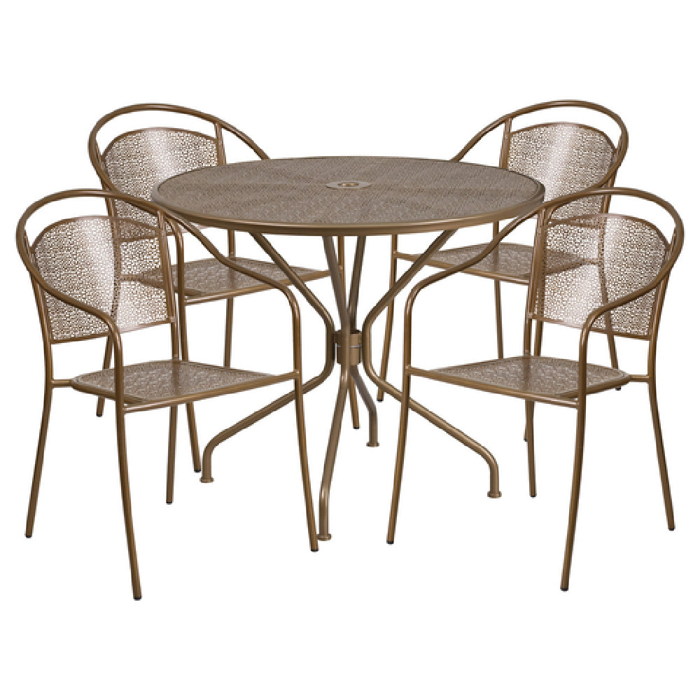 The Flash Furniture CO-35RD-03CHR4-GD-GG Patio Table Set is a comprehensive outdoor solution, featuring a single round table with dimensions of 35-1/4 inches in diameter and 28-3/4 inches in height, complemented by a rain flower design top that adds aesthetic appeal and functionality. This table includes a 1-1/2 inch diameter umbrella hole for added versatility in sun protection, and a 1 inch edge, ensuring stability and durability. Accompanying the table are four stacking armchairs, each designed with a round back and a matching rain flower design on the back and seat. These chairs are constructed with a robust 1.2mm tubular frame and can support up to 300 pounds, stacking up to 8 chairs high for convenient storage. Equipped with plastic floor glides, the set is designed for both indoor and outdoor use. Made from durable steel with a powder coat finish in gold, this patio set offers both style and resilience. Assembly is required, and the set is shipped in two boxes, with in-stock items typically shipping within 24 hours. This product is ideal for residential and commercial settings where durable, stylish, and functional outdoor furniture is required.