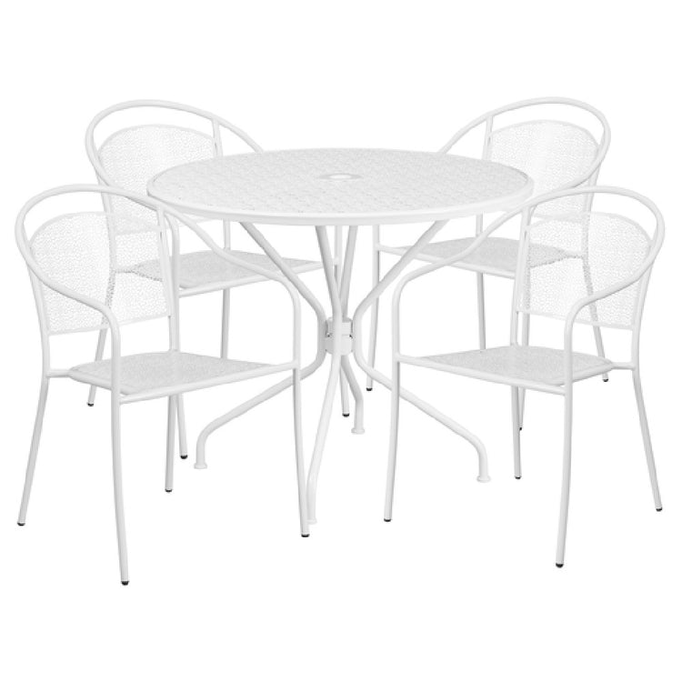 The Flash Furniture CO-35RD-03CHR4-WH-GG Patio Table Set is a versatile and elegant option for enhancing both indoor and outdoor spaces. This set includes a round table measuring 35-1/4 inches in diameter and 28-3/4 inches in height, featuring a distinctive rain flower design top with a 1-1/2-inch umbrella hole and a 1-inch edge, making it perfect for accommodating a parasol. Complementing the table are four stacking armchairs, each with a round back and matching rain flower design on the back and seat. These chairs are supported by a sturdy 1.2mm tubular steel frame, capable of withstanding a weight capacity of up to 300 pounds. Additionally, the chairs can be conveniently stacked up to 8 high, optimizing space when not in use. The set is powder-coated in a sleek white finish, ensuring durability and resistance to the elements. Plastic floor glides protect flooring surfaces, making this set suitable for diverse settings. This patio table set comes with assembly required and is shipped in two boxes. Typically, in-stock items ship within 24 hours, allowing for quick and efficient delivery. Ideal for both residential and commercial use, this patio set seamlessly blends functionality with style.