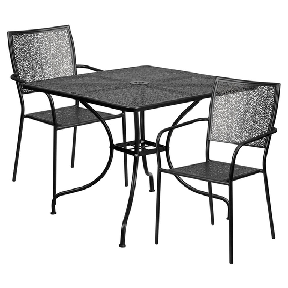 The Flash Furniture CO-35SQ-02CHR2-BK-GG Patio Table Set is an elegant and functional solution designed for both indoor and outdoor environments. This set includes a square table measuring 35-1/2"W x 35-1/2"D x 28-3/4"H, featuring a distinctive rain flower design top that adds a touch of elegance and functionality to any patio or dining space. The table is equipped with a 1-3/4" diameter umbrella hole and a sturdy 1" edge, providing versatility for shaded outdoor dining. Accompanying the table are two stacking armchairs, each with a square back and matching rain flower design on the back and seat, constructed with a robust 1.2mm tubular steel frame. These chairs offer a substantial weight capacity of up to 300 lbs and can be stacked up to 8 chairs high, optimizing storage space. The set is finished with a durable black powder coat, ensuring longevity and resistance to the elements. To protect floors, the chairs include plastic floor glides. Assembly is required, and the set ships in two boxes, with in-stock items typically dispatched within 24 hours. This set is a versatile addition to various settings, from residential patios to commercial outdoor dining areas.