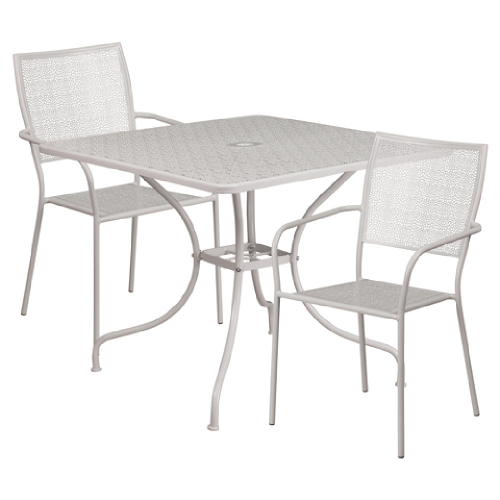 The Flash Furniture CO-35SQ-02CHR2-SIL-GG patio table set is a versatile and stylish addition to any indoor or outdoor space. This set includes a square table measuring 35-1/2"W x 35-1/2"D x 28-3/4"H, featuring a rain flower design top that adds a touch of elegance to its functionality. The table is equipped with a 1-3/4" diameter umbrella hole, offering the option to add shade on sunny days. Complementing the table are two stacking arm chairs, each with a square back and rain flower design on both the back and seat, ensuring a cohesive aesthetic. The chairs boast a 1.2mm tubular steel frame, providing durability and a weight capacity of 300 pounds. They can be stacked up to eight chairs high, optimizing storage space. Designed with plastic floor glides, the chairs are easy to move and protect flooring surfaces. Constructed with a powder-coated steel finish in light gray, this set is built to withstand various weather conditions, making it ideal for both residential and commercial use. Assembly is required, and the product ships in two boxes, with in-stock items typically shipping within 24 hours, ensuring quick and efficient delivery.