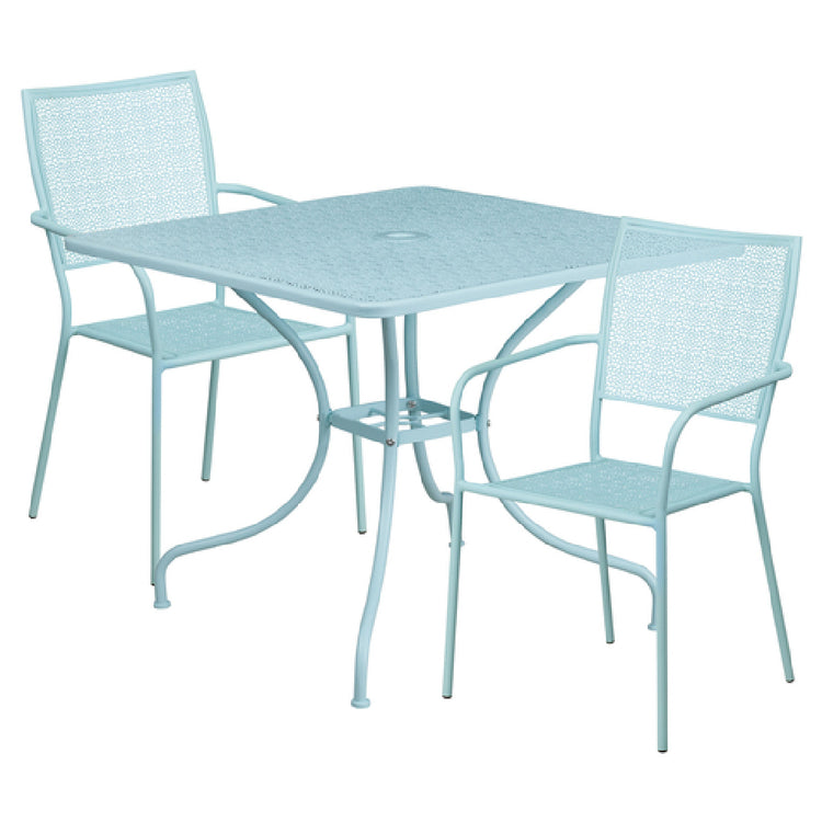 The Flash Furniture CO-35SQ-02CHR2-SKY-GG Patio Table Set is a meticulously crafted furniture set designed for both indoor and outdoor environments. At its center is a square table measuring 35-1/2"W x 35-1/2"D x 28-3/4"H, featuring an elegant rain flower design top, which adds a touch of sophistication to any setting. The table is equipped with a 1-3/4" diameter umbrella hole, allowing for comfortable shaded use. Complementing the table are two stacking arm chairs, each boasting a square back with a matching rain flower design on both the back and seat. The chairs are built with a durable 1.2mm tubular steel frame, ensuring a robust weight capacity of up to 300 lbs. These chairs can be stacked up to 8 high, facilitating easy storage and space-saving solutions. Finished in a sky blue powder coat, this set not only delivers on style but also on durability, with plastic floor glides protecting surfaces from scratches. Shipped in two boxes and requiring assembly, it is designed for prompt delivery, usually shipping within 24 hours. This patio table set is ideal for cafes, bistros, or residential patios that require functional and stylish outdoor furniture solutions.