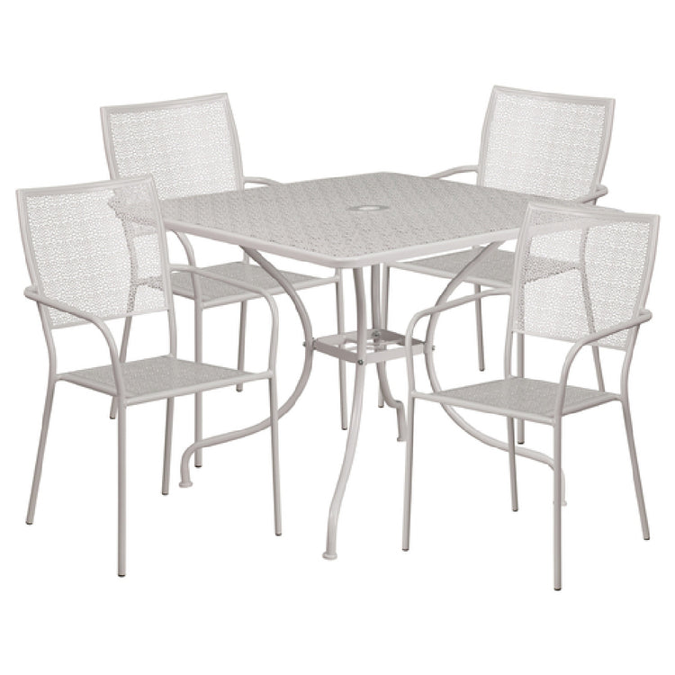 Flash Furniture CO-35SQ-02CHR4-SIL-GG Patio Table Set is a versatile and robust outdoor ensemble, ideal for both residential and commercial environments. The set includes one square table with dimensions of 35-1/2 inches in width, 35-1/2 inches in depth, and 28-3/4 inches in height, featuring a distinctive rain flower design top. This table is equipped with a 1-3/4-inch diameter umbrella hole, enhancing its functionality for outdoor use. The set also comprises four stacking arm chairs, each designed with a square back and a rain flower pattern on both the back and seat, supported by a sturdy 1.2mm tubular steel frame. Each chair can comfortably support up to 300 pounds and can be stacked up to eight chairs high for efficient storage. The chairs include plastic floor glides to protect surfaces and facilitate smooth movement. This patio set is coated with a durable powder finish in light gray, ensuring longevity and resistance to weather conditions, making it suitable for indoor and outdoor use. Assembly is required, and the set is shipped in two boxes, typically ready to ship within 24 hours. This patio table set combines style, practicality, and durability, catering to various market segments seeking quality outdoor furniture solutions.
