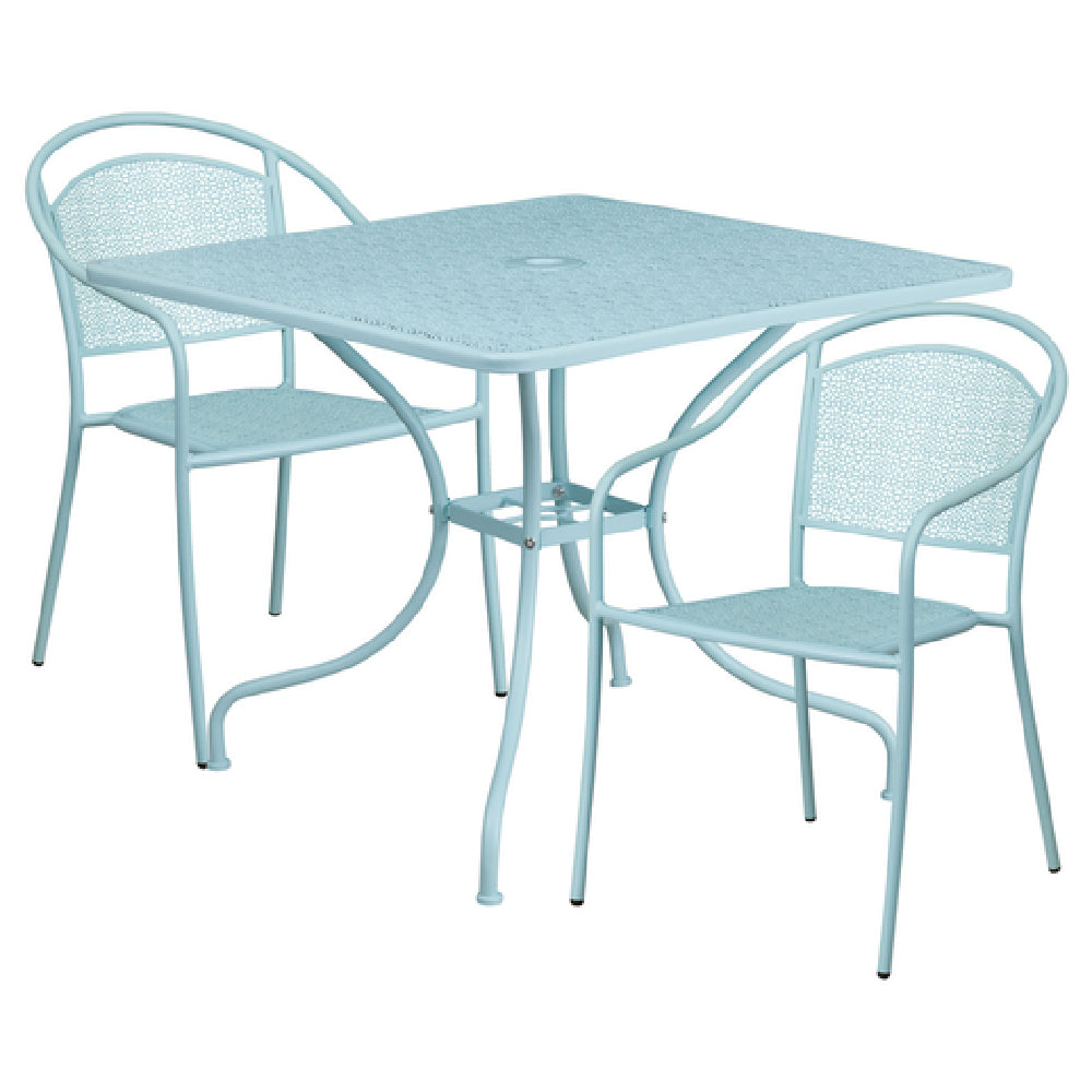 The Flash Furniture CO-35SQ-03CHR2-SKY-GG Patio Table Set is a versatile and stylish addition to any indoor or outdoor living space, designed to bring function and flair to both residential and commercial settings. This set features a square table measuring 35-1/2 inches in both width and depth, standing 28-3/4 inches high, and is adorned with a rain flower design top that adds visual interest while offering durability. It includes a 1-3/4-inch diameter umbrella hole for additional functionality, accommodating outdoor umbrellas for shade and comfort. The table's edge measures 1 inch in thickness. Accompanying the table are two stacking arm chairs, each boasting a round back with the same rain flower design, providing aesthetic cohesion and comfort. Constructed with a 1.2mm tubular steel frame, these chairs support up to 300 pounds and are designed to stack up to eight chairs high, optimizing storage space. With plastic floor glides, the chairs ensure ease of movement and floor protection. Completed with a sky blue powder coat finish, this steel set is built for resilience against the elements, emphasizing longevity for both indoor and outdoor use. Assembly is required and the set ships in two boxes, typically dispatched within 24 hours for in-stock items.