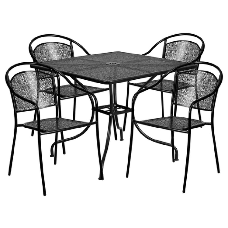 Flash Furniture CO-35SQ-03CHR4-BK-GG Patio Table Set is an elegant and functional ensemble, perfect for enhancing any outdoor or indoor space. The set includes a square table measuring 35-1/2"W x 35-1/2"D x 28-3/4"H, featuring a distinctive rain flower design top and a 1-3/4" diameter umbrella hole, providing flexibility for shaded outdoor dining. The table is complemented by four stacking armchairs, each designed with a round back and a rain flower pattern on the back and seat, ensuring both aesthetic appeal and comfort. These chairs boast a sturdy 1.2mm tubular frame and can support a weight capacity of 300 lbs, stacking efficiently up to 8 chairs high for convenient storage. With plastic floor glides and a durable steel construction coated in a sleek black powder finish, this set is engineered for longevity and versatility in both indoor and outdoor settings. Assembly is required, and the product is delivered in two boxes. Typically shipping within 24 hours for in-stock items, the Flash Furniture patio set is an ideal choice for cafes, bistros, restaurants, and residential settings seeking a blend of style, durability, and functionality.