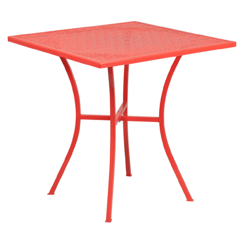 The Flash Furniture CO-5-RED-GG Patio Table is a sleek and modern addition for both indoor and outdoor environments, measuring 28 inches in width, 28 inches in depth, and 28-1/4 inches in height. This square table features a distinctive rain flower design top with a 1-inch edge, offering a unique aesthetic appeal. Crafted from durable steel, it is finished with a corrosion-resistant powder coat in a vibrant coral hue, ensuring longevity and style. Its versatile design is ideal for various market segments, including residential patios, commercial cafes, and hospitality venues. The table's robust construction accommodates different settings, providing a stable and attractive surface for dining or social gatherings. Assembly is required but straightforward, with in-stock items typically shipping within 24 hours, making it a convenient choice for quick setups. The Flash Furniture CO-5-RED-GG Patio Table seamlessly combines functionality with design, making it a go-to option for those seeking a reliable, stylish, and adaptable table solution for diverse environments.