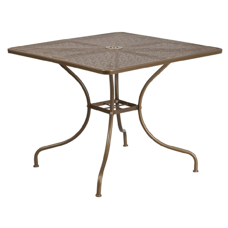 The Flash Furniture CO-6-GD-GG Patio Table is a versatile square table with dimensions of 35-1/2" x 35-1/2" x 28-3/4"H, making it a suitable choice for various settings. This table features a distinctive rain flower design top, adding a touch of elegance and uniqueness to any patio or dining space. It includes a convenient 1-3/4" diameter umbrella hole, allowing for comfortable shading options during sunny days. The table's 1" edge enhances its stability and durability, ensuring it can withstand regular use in both indoor and outdoor environments. Constructed from steel with a powder coat finish in a striking gold color, this table promises longevity and resistance to weather elements. Additionally, the protective plastic floor glides protect surfaces from scratches and facilitate easy movement. Assembly is required for this product, but once assembled, it stands as a sturdy and stylish piece. In stock items typically ship within 24 hours, offering prompt delivery for immediate use. Designed to meet the diverse needs of residential and commercial markets, the Flash Furniture CO-6-GD-GG Patio Table combines aesthetic appeal with practical functionality, catering to both private homeowners and businesses looking for reliable outdoor furniture solutions.