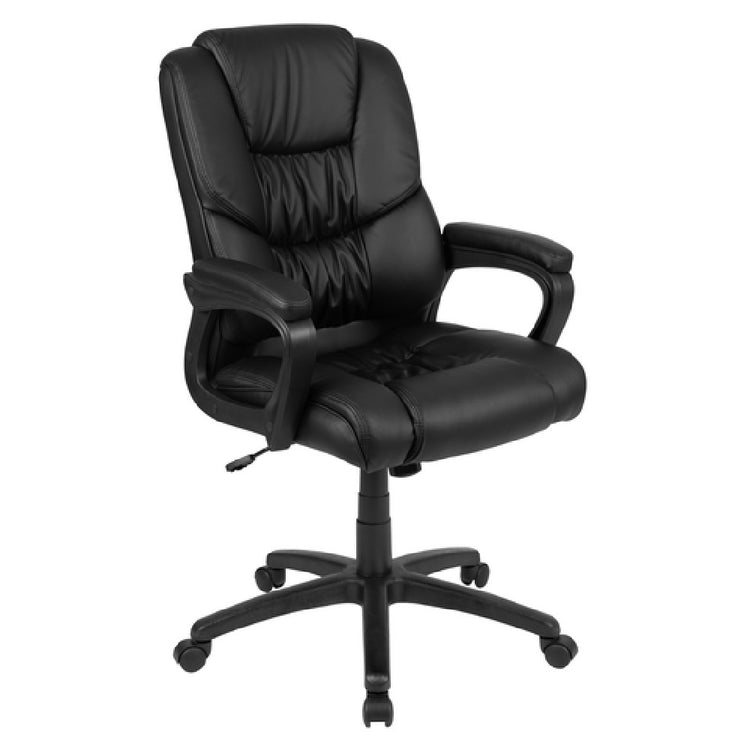 The Flash Furniture CX-1179H-BK-GG Swivel Chair is engineered with a remarkable 400 lb. weight capacity, catering to diverse user needs across various industries. This chair is upholstered in LeatherSoft, a blend of leather and polyurethane, providing both durability and comfort, making it suitable for extended use in professional environments such as offices and conference rooms. Equipped with a pneumatic adjustable seat height, the chair allows for seamless customization to accommodate users of different statures, enhancing ergonomic support throughout long workdays. The inclusion of a tilt lever further enhances the chair's flexibility, enabling users to recline comfortably. Padded arms provide additional support, reducing strain on the shoulders during prolonged use. The chair is fitted with dual-wheel casters, facilitating smooth movement across different floor surfaces, which is particularly beneficial in dynamic workspaces. Certified by BIFMA, this chair adheres to rigorous safety and performance standards, ensuring reliability and peace of mind for users. The sleek black design of the CX-1179H-BK-GG Swivel Chair complements various office aesthetics, making it a versatile choice for any corporate setting. This chair combines robust functionality with sophisticated design, offering a compelling seating solution for a broad spectrum of professional environments.