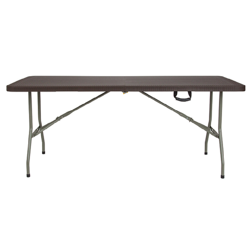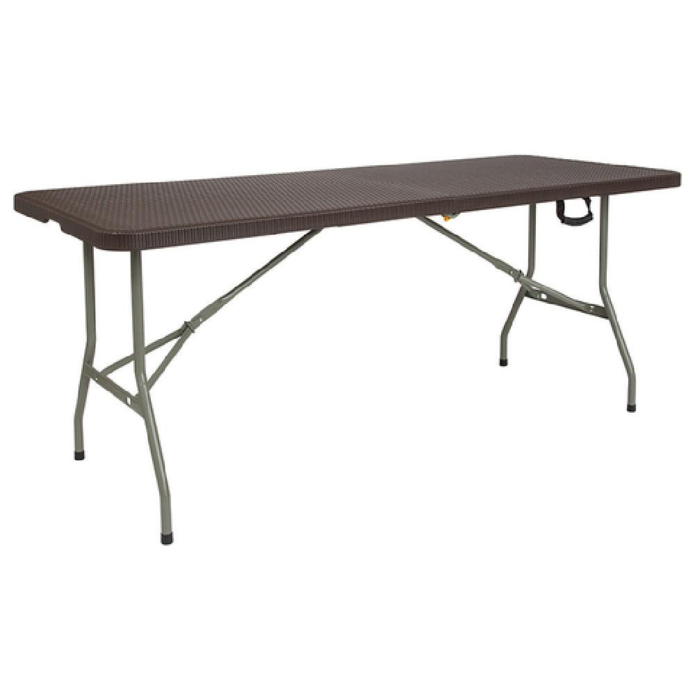 The Flash Furniture DAD-FT-180Z-GG Folding Table 71"W x 29"D x 29"H Rectangular is a versatile piece designed for both indoor and outdoor environments with a focus on functionality and durability. Measuring 71 inches in width, 29 inches in depth, and 29 inches in height, this table comfortably accommodates up to six adults, making it ideal for a variety of settings such as conferences, events, or casual gatherings. Its 330 lb. static load capacity ensures robust support for various uses. The 1-1/2 inch thick brown tabletop features a distinctive rattan pattern, providing an elegant aesthetic while being waterproof and resistant to impact and stains, making it a practical choice for unpredictable weather conditions or heavy use. For easy storage and transport, the table incorporates a half-fold design and a convenient carrying handle. The gray powder-coated legs are lockable, adding stability, while the protective floor caps prevent damage to indoor surfaces. This design consideration underscores its adaptability to different environments, offering a reliable solution for both casual and professional settings.