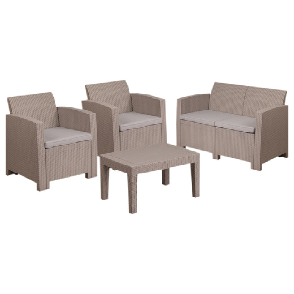 The Flash Furniture DAD-SF-112T-CRC-GG Outdoor Patio Set 4-piece is an exceptional choice for any outdoor space, combining style and functionality with its all-weather design and durable construction. This set includes two chairs measuring 26-3/4"W by 27"D by 30"H, a loveseat sized at 47"W by 27"D by 30"H, and a coffee table measuring 27-3/4"W by 19-3/4"D by 15"H, making it ideal for both small gatherings and larger outdoor settings. The faux rattan resin frame provides a contemporary aesthetic while ensuring long-lasting use. Equipped with charcoal plastic block feet, it maintains stability on various surfaces. The CA117 fire retardant dense foam cushions, in a versatile gray, are removable, adding convenience for cleaning and storage. Curved arms enhance the comfort and elegance of the seating pieces. This patio set ships in four boxes, and in-stock items typically dispatch within 24 hours, ensuring quick delivery. While assembly is required, the robust materials used ensure the longevity of the set, making it a suitable investment for both residential and commercial outdoor spaces. Its thoughtful design and durable materials offer a unique value proposition for diverse market segments within the outdoor furniture industry.