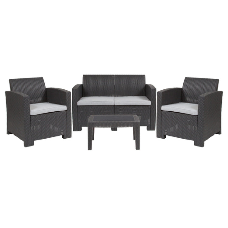 The Flash Furniture DAD-SF-112T-DKGY-GG Outdoor Patio Set is a comprehensive 4-piece ensemble designed to enhance your outdoor living space with style and functionality. It includes two chairs measuring 26-3/4"W x 27"D x 30"H, a loveseat sized at 47"W x 27"D x 30"H, and a coffee table with dimensions of 27-3/4"W x 19-3/4"D x 15"H. Each piece features curved arms and is crafted from a durable resin frame with a faux rattan finish, providing both aesthetic appeal and resilience against the elements. The all-weather construction is complemented by CA117 fire retardant dense foam, ensuring safety and comfort. The set is furnished with gray removable seat cushions for easy maintenance and added comfort. Plastic block feet provide stability and protect your surfaces. Designed in a sophisticated dark gray shade, this set requires assembly and is shipped in four boxes, with in-stock items typically dispatched within 24 hours. Ideal for various market segments, from homeowners seeking durable and stylish patio furniture to commercial venues looking for reliable outdoor seating solutions, the Flash Furniture Patio Set stands out for its practical features and elegant design.