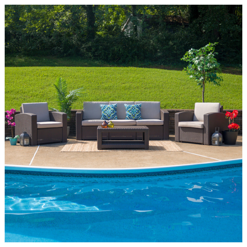 The Flash Furniture DAD-SF-113R-CBN-GG Chair Sofa and Table Set Faux Rattan is a versatile and stylish 4-piece set designed to elevate any outdoor or indoor space. This set includes a chair, sofa, and table, all crafted from faux rattan, which is known for its durability and ability to withstand diverse weather conditions. The all-weather resin frame ensures long-lasting performance, making it an ideal choice for various market segments, from residential patios to commercial outdoor seating areas. The chocolate brown color adds a touch of elegance, seamlessly blending with a range of decor styles. One of the unique features of this set is the removable cushion covers, which offer convenience in cleaning and maintenance, essential for high-use environments. This set not only provides functional seating and table space but also enhances the aesthetic appeal of any setting. With its combination of practicality, style, and resilience, the Flash Furniture DAD-SF-113R-CBN-GG set stands out as a valuable addition to different industry segments, meeting the needs of both homeowners and business operators seeking quality outdoor furniture solutions.