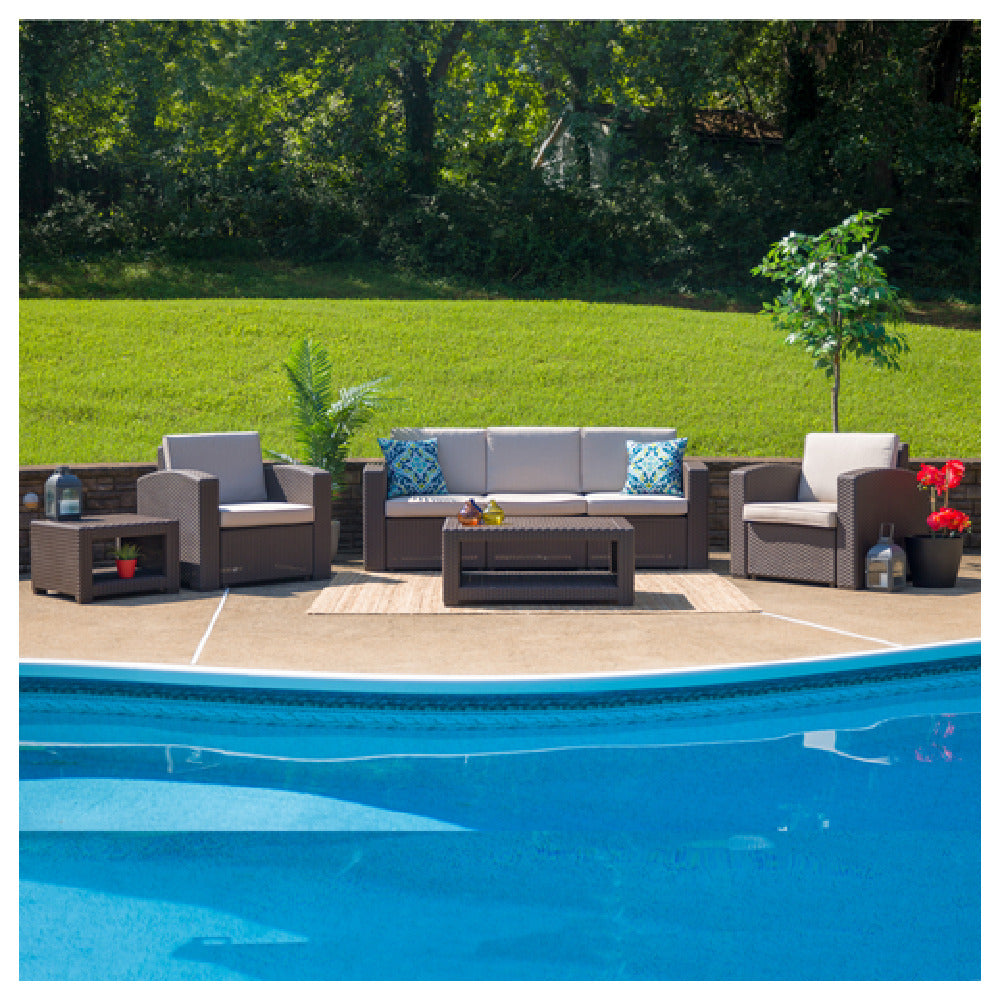 The Flash Furniture DAD-SF-113RS-CBN-GG Chair Sofa and Table Set - faux rattan, is a versatile 5-piece set designed for both style and functionality, making it suitable for various settings such as patios, garden areas, or sunrooms. This sophisticated set features an all-weather resin frame that ensures durability and longevity, making it capable of withstanding different weather conditions. The faux rattan construction gives it an elegant and natural look, enhancing the aesthetic appeal of any outdoor or indoor space. The chocolate brown color palette adds a touch of warmth and sophistication, easily blending with various decor styles. An added convenience is the removable cushion covers, which allow for easy cleaning and maintenance, ensuring that the set remains pristine over time. This set provides a complete seating solution, including a chair, sofa, and table, offering ample space for relaxation and entertainment. It's an excellent choice for homeowners looking to create a comfortable and stylish outdoor living area, as well as for businesses in the hospitality industry aiming to enhance their guest experience with chic and durable furniture options.