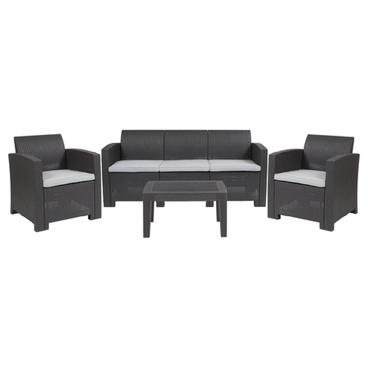 The Flash Furniture DAD-SF-113T-DKGY-GG Outdoor Patio Set 4-piece offers a sophisticated blend of style and functionality for any outdoor setting. This set includes two chairs measuring 26-3/4"W x 27"D x 30"H, a generous sofa at 67-1/2"W x 27"D x 30"H, and a practical coffee table sized 27-3/4"W x 19-3/4"D x 15"H. Crafted for all-weather durability, the set features a resin frame and faux rattan design, complemented by dark gray removable seat cushions for added comfort and convenience. With curved arms and plastic block feet, this set is both stylish and stable, ideal for residential patios or commercial outdoor spaces. The CA117 fire retardant dense foam ensures safety and resilience in various environments. This versatile set requires assembly and is delivered in four boxes, with in-stock items typically shipping within 24 hours. Its thoughtful design and robust materials make it a valuable addition to any outdoor area, providing both aesthetic appeal and practical seating solutions for diverse market segments.