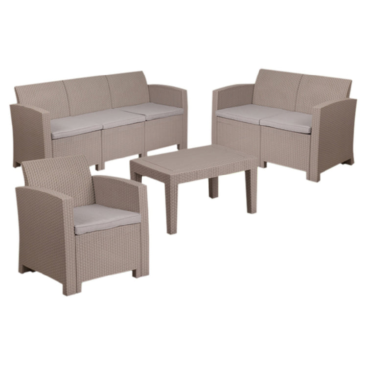 The Flash Furniture DAD-SF-123T-CRC-GG Outdoor Patio Set 4-piece is a versatile and stylish addition to any outdoor space. This comprehensive set includes a 26-3/4"W x 27"D x 30"H chair, a 67-1/2"W x 27"D x 30"H sofa, a 47"W x 27"D x 30"H loveseat, and a 27-3/4"W x 19-3/4"D x 15"H coffee table, all designed for comfort and functionality. The pieces feature curved arms and are constructed with a durable resin frame and faux rattan finish, making them ideal for all weather conditions. The set is equipped with CA117 fire retardant dense foam and includes gray removable seat cushions for added convenience and safety. The plastic block feet ensure stability on various surfaces. Assembly is required for this set, which ships in four boxes, with in-stock items typically shipping within 24 hours. This patio set is perfect for residential or commercial use, providing a cozy and sophisticated environment for lounging or entertaining. Its robust design and practical features cater to different segment markets, ensuring it meets the diverse needs of consumers seeking both aesthetic appeal and durability in outdoor furniture.
