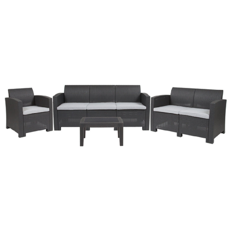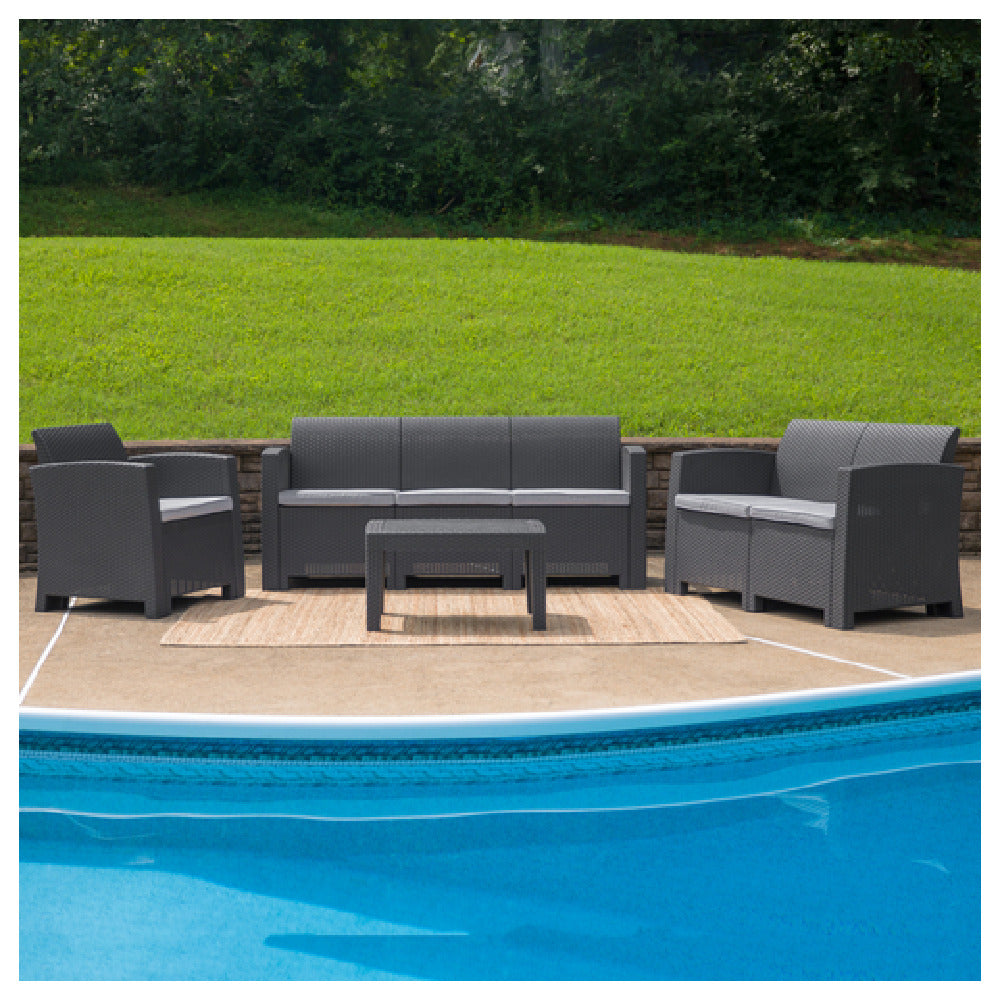 The Flash Furniture DAD-SF-123T-DKGY-GG Outdoor Patio Set is a comprehensive 4-piece ensemble designed to enhance your outdoor living space with both functionality and aesthetic appeal. This set includes a chair measuring 26-3/4"W x 27"D x 30"H, a sofa measuring 67-1/2"W x 27"D x 30"H, a loveseat with dimensions of 47"W x 27"D x 30"H, and a coffee table sized at 27-3/4"W x 19-3/4"D x 15"H. Each piece features curved arms and is constructed from faux rattan with a durable resin frame, ensuring longevity and resilience against the elements. The all-weather design includes CA117 fire retardant dense foam and gray removable seat cushions for added comfort and safety. The patio set also boasts plastic block feet for stability. This configuration ships in four boxes and generally leaves the warehouse within 24 hours, making it a convenient choice for those seeking a quick upgrade to their outdoor décor. This versatile set is ideal for various market segments, including residential use for cozy family gatherings, hospitality sectors looking to furnish outdoor spaces, and commercial venues aiming for a stylish yet durable solution for outdoor seating.