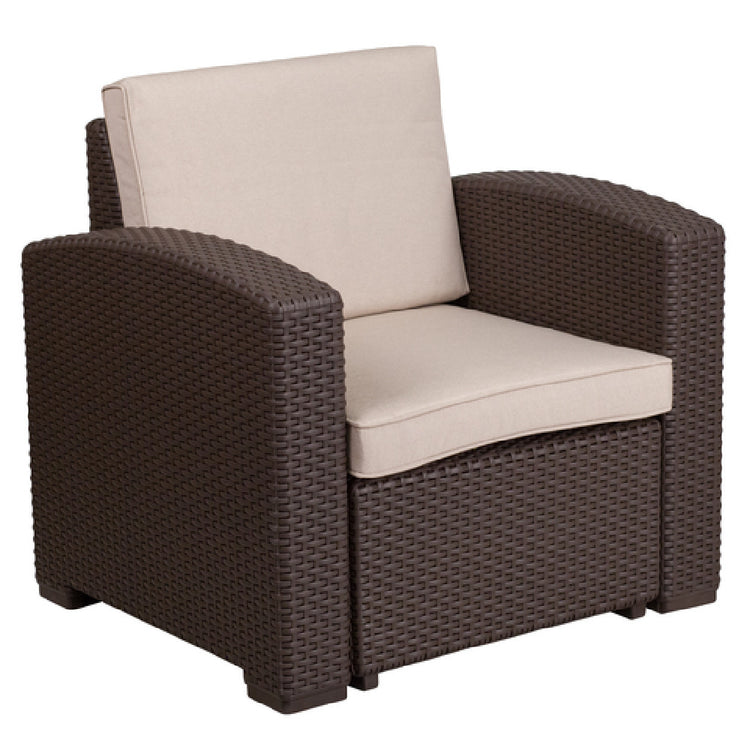 The Flash Furniture DAD-SF1-1-GG Outdoor Chair combines style and durability, measuring 32-3/4"W x 28"D x 32"H, making it suitable for various outdoor settings. Its design features curved arms and a chocolate brown faux rattan resin frame, emphasizing both comfort and aesthetic appeal. The chair includes beige removable seat and back cushions, providing added convenience and ease of maintenance. A key technical attribute is the CA117 fire retardant dense foam, ensuring safety and compliance with fire safety standards. The chair's all-weather construction enhances its durability, making it resistant to diverse weather conditions and ideal for outdoor use in both residential and commercial environments. The plastic block feet further contribute to its stability and longevity. Assembly is required, and for prompt delivery, in-stock items typically ship within 24 hours. This outdoor chair appeals to a wide range of market segments, from homeowners looking to enhance their patio or garden spaces to businesses in the hospitality industry that require reliable and stylish outdoor seating solutions. The combination of technical specifications and thoughtful design elements makes the Flash Furniture DAD-SF1-1-GG a versatile and valuable addition to any outdoor setting.