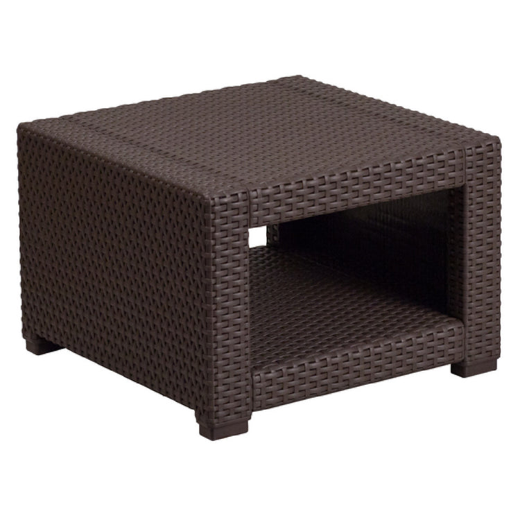 The Flash Furniture DAD-SF1-S-GG Outdoor End Table is designed to complement any outdoor setting with its functional and stylish design. Measuring 22 inches in width, 22 inches in depth, and 15-1/4 inches in height, this square end table offers ample surface space for outdoor gatherings or quiet relaxation moments. Its all-weather construction, featuring a faux rattan texture, ensures durability and resilience against various weather conditions, making it a reliable addition to your outdoor furniture collection. The table is crafted with a sturdy resin frame, providing a robust structure that is both lightweight and easy to maneuver. The plastic block feet add stability, protecting surfaces from scratches and ensuring a balanced setup. Available in a rich chocolate brown hue, this table blends seamlessly with a wide range of outdoor décor styles. With an open storage area, it offers convenient space for storing outdoor necessities like magazines or small gardening tools. Assembly is required, but in-stock items typically ship within 24 hours, ensuring a timely addition to your patio or garden setup. This versatile piece is ideal for both residential and commercial outdoor spaces, offering practical utility and aesthetic appeal.