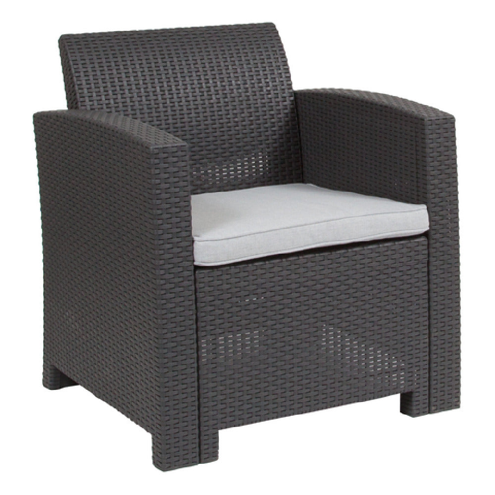 The Flash Furniture DAD-SF2-1-DKGY-GG Outdoor Chair is a meticulously designed piece measuring 26-3/4"W x 27"D x 30"H, ideal for enhancing outdoor spaces with its sophisticated style and functionality. This chair features elegantly curved arms and is crafted to withstand various weather conditions, making it a reliable choice for year-round outdoor use. The chair's structure includes a CA117 fire retardant dense foam, providing safety and comfort for users. It comes with a gray removable seat cushion, allowing for easy maintenance and adaptability to different design preferences. Constructed with durable faux rattan and a sturdy resin frame, this chair is built to last, while its plastic block feet ensure stability on various surfaces. The dark gray finish adds a contemporary touch, making it suitable for both residential and commercial outdoor settings. The assembly required aspect emphasizes its customizable nature, allowing users to have a hands-on approach in setting it up. Additionally, the fact that in-stock items usually ship within 24 hours underscores its accessibility and convenience for buyers looking for timely and efficient delivery. This outdoor chair is a versatile and practical addition, catering to diverse market segments seeking quality and style in outdoor furniture.