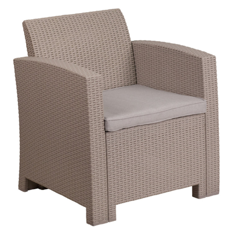 The Flash Furniture DAD-SF2-1-GG Outdoor Chair - 26-3/4"W x 27"D x 30"H - is a versatile seating solution designed for diverse outdoor environments, combining durability and comfort with its thoughtful design. This chair features curved arms and a faux rattan appearance, crafted from a resilient resin frame to withstand various weather conditions. The inclusion of a gray removable seat cushion, made from CA117 fire retardant dense foam, offers added safety and comfort, making it suitable for various settings, from casual home patios to commercial hospitality venues. With plastic block feet, this chair remains stable on different surfaces, enhancing usability across different locations. Available in charcoal, it complements a variety of outdoor décors. The requirement for assembly is minimal, allowing for quick setup, and with most items in stock, it is usually ready to ship within 24 hours, ensuring quick delivery for immediate use. The Flash Furniture DAD-SF2-1-GG Outdoor Chair stands out in the market for its blend of aesthetic appeal and functional design, catering to both residential and commercial sectors seeking a reliable and stylish outdoor seating option.