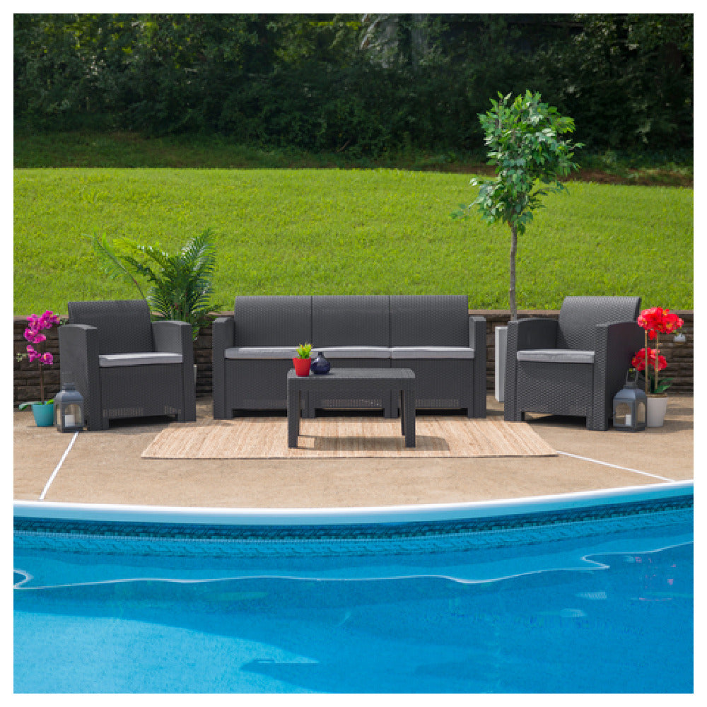 The Flash Furniture DAD-SF2-T-DKGY-GG Outdoor Coffee Table, measuring 27-3/4 inches in width, 19-3/4 inches in depth, and 15 inches in height, is a versatile and durable addition to any outdoor setting. Constructed with an all-weather faux rattan resin frame, this table is designed to withstand the elements, ensuring longevity and resilience in various climates. The dark gray finish adds a modern and sophisticated touch, making it suitable for diverse outdoor aesthetics. Equipped with plastic block feet, this table offers stability on a variety of surfaces, enhancing its functionality in different environments. Assembly is required, but the process is straightforward, allowing users to quickly integrate this piece into their outdoor spaces. In stock items are typically shipped within 24 hours, ensuring prompt delivery. Ideal for residential patios, commercial outdoor lounges, or hospitality venues, the Flash Furniture DAD-SF2-T-DKGY-GG Outdoor Coffee Table combines style and practicality. Its robust design and quality materials make it a reliable choice for those seeking a chic yet durable outdoor furniture solution. This table meets the needs of various market segments, from individual homeowners to businesses in the hospitality industry, by providing a quality product that enhances outdoor spaces.
