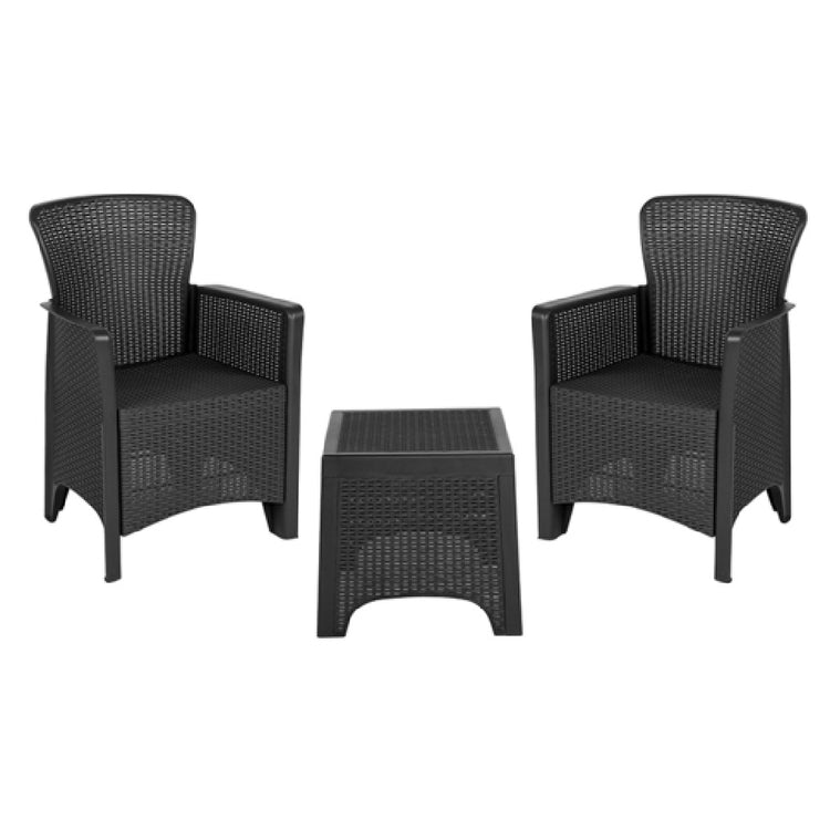 The Flash Furniture DAD-SF3-2P-SET-GG Seating Set 3-piece is an outdoor ensemble meticulously designed for those seeking both style and durability. This set includes two chairs, each measuring 22-1/2"W x 19-1/4"D x 33-1/2"H, and a compact side table with dimensions of 15-1/4"W x 15-1/4"D x 15-1/2"H. Crafted with a faux rattan resin frame, this seating set exemplifies an all-weather construction, ensuring resilience against various outdoor elements. The interlocking construction offers stability, making it a reliable choice for patios, gardens, or balconies. Its dark gray hue provides a sleek and modern aesthetic, suitable for diverse outdoor décors. The straight arms on the chairs enhance comfort, adding to the leisurely experience. Whether for personal enjoyment or entertaining guests, the Flash Furniture DAD-SF3-2P-SET-GG Seating Set is a practical choice, balancing aesthetics with functionality. Assembly is required, and in-stock items typically ship within 24 hours, ensuring a quick addition to your outdoor space. This seating set is particularly appealing to consumers looking for a durable and stylish furniture solution for their outdoor living areas.