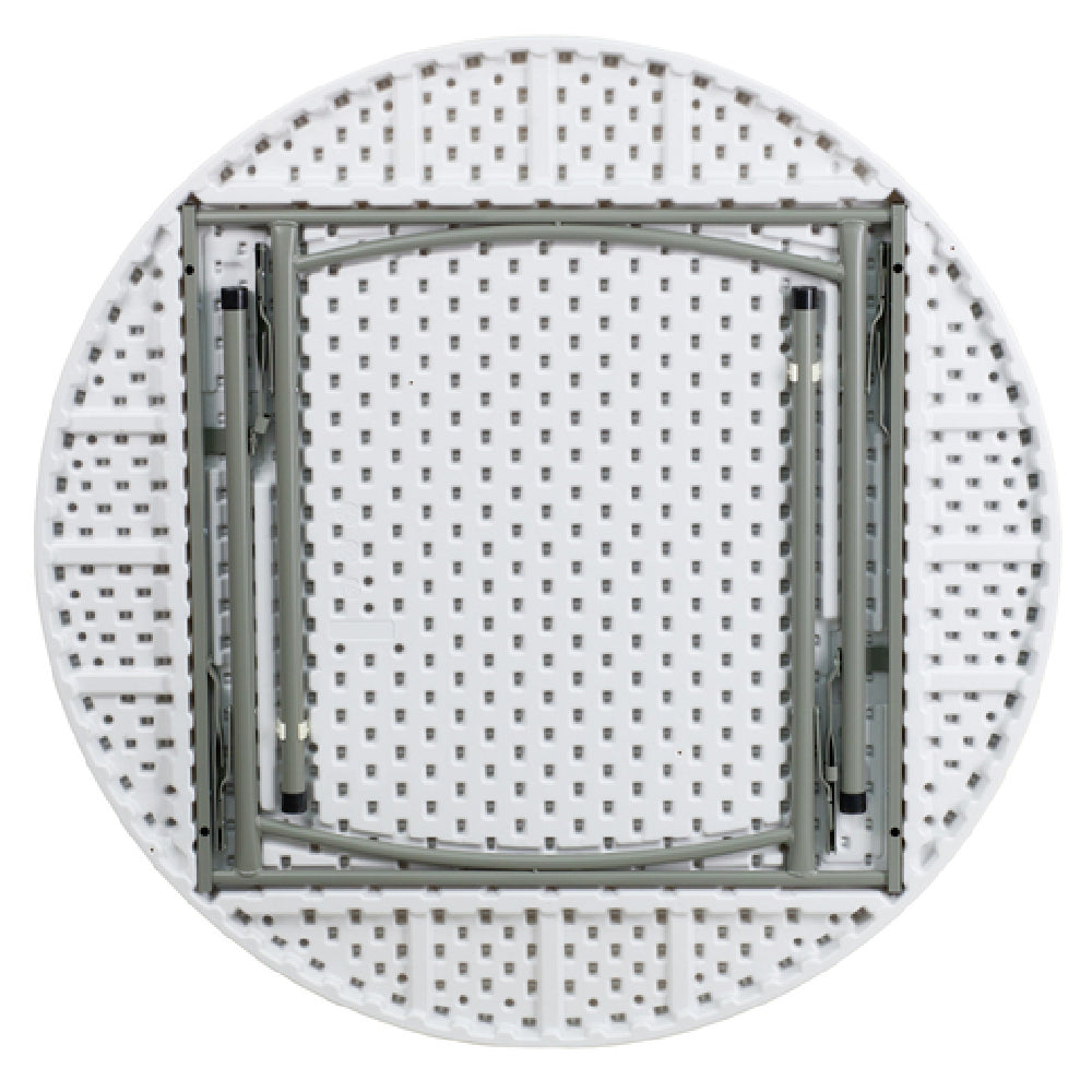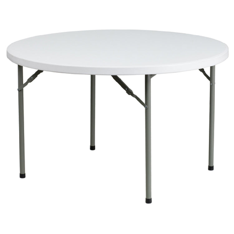 The Flash Furniture DAD-YCZ-122R-GG Folding Table is a versatile solution for both indoor and outdoor settings, tailored to accommodate up to 5-6 adults comfortably. With a diameter of 48 inches and a height of 29-1/4 inches, this round table provides ample space for various activities, from dining to professional meetings. Its 1-1/2 inch thick granite white plastic tabletop is not only aesthetically pleasing but also offers a substantial 500 lb. static load capacity, ensuring durability and strength. The table's gray powder-coated metal legs are equipped with a locking mechanism for stability, while protective floor caps prevent damage to floor surfaces. Designed to withstand the elements, the table’s top is waterproof, impact, and stain-resistant, highlighting its suitability for multi-environment use. These features make it an ideal choice for event planners, hospitality businesses, and home users looking for reliability and ease of use. Furthermore, the table is designed for quick shipping, typically dispatching within 24 hours, ensuring prompt availability to meet urgent demands. This folding table stands out in the market as a practical and robust furnishing option, particularly valued for its combination of functionality, durability, and modern design.
