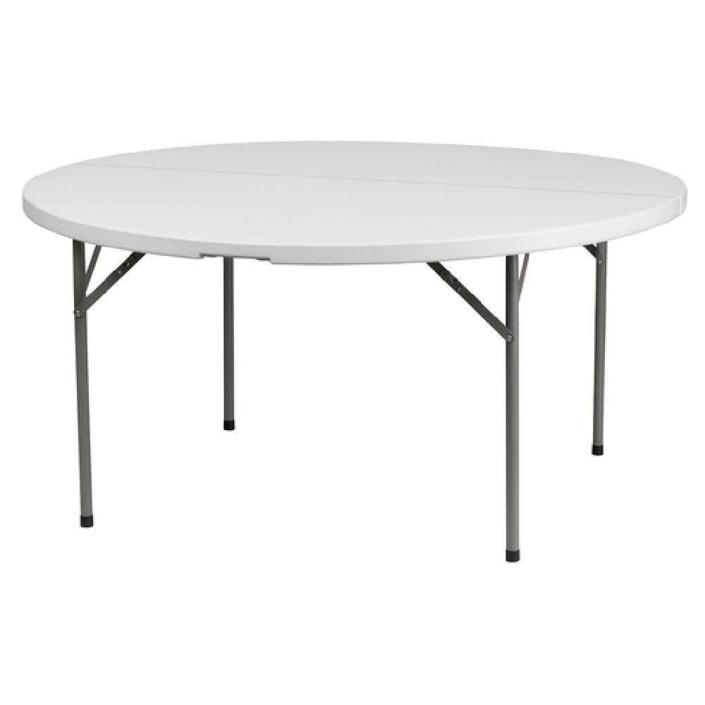 The Flash Furniture DAD-YCZ-154-GW-GG Folding Table - 60" dia. x 29"H - is engineered to accommodate up to 8 adults comfortably, making it a versatile choice for a variety of settings. Its robust design ensures a static load capacity of 661 lb., demonstrating its capability for both personal and professional use. The table features a 1-3/4" thick granite white plastic top, offering a sleek yet durable surface that is both waterproof and resistant to impact and stains. This makes it ideal for both indoor and outdoor applications, catering to diverse needs in hospitality, event planning, and office environments. The gray powder coated metal locking legs provide stability, while the protective floor caps prevent damage to surfaces. This table is designed for easy storage and transport, with its folding capability allowing for space-saving solutions. Typically, in-stock items are dispatched within 24 hours, ensuring quick availability. The Flash Furniture DAD-YCZ-154-GW-GG Folding Table stands out in the market for its practical design, durability, and adaptability, making it a valuable asset for any event or space where flexibility and reliability are paramount.