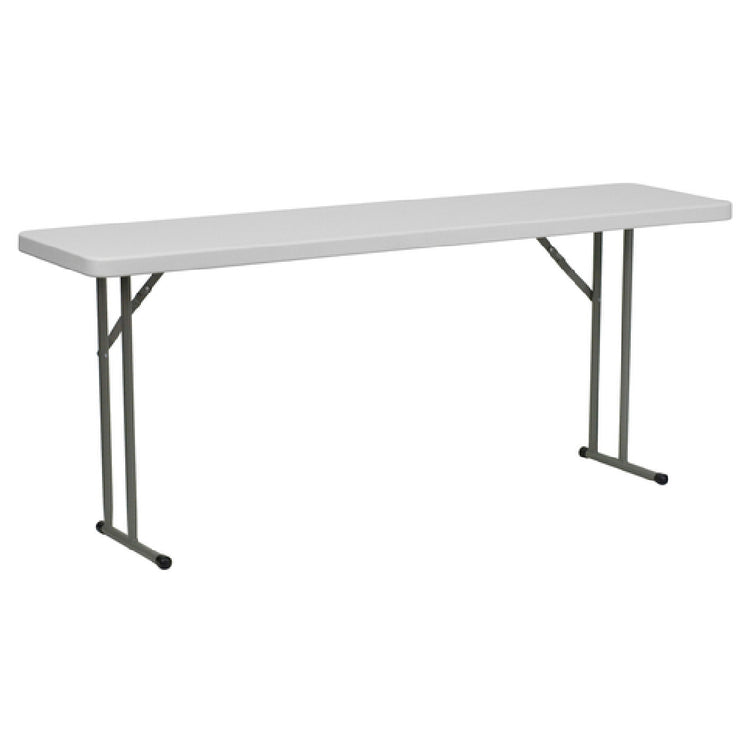 The Flash Furniture DAD-YCZ-180-GW-GG Folding Table is a versatile and robust solution for a variety of settings, from educational environments to conference rooms, and even outdoor events. Measuring 72 inches in width, 18 inches in depth, and 29 inches in height, this rectangular table can comfortably accommodate up to three adults. The table features a 1-3/4 inch thick granite white plastic tabletop that is both waterproof and impact-resistant, making it ideal for both indoor and outdoor use. Constructed to withstand a static load capacity of 220 lbs, it is designed to handle daily wear and tear with ease. The gray powder-coated metal locking legs add an element of stability and durability, while the protective floor caps help prevent damage to surfaces. This folding table's design emphasizes convenience and ease of use, with a structure that allows for quick setup and takedown, making it a practical option for professionals who need reliable, transportable furniture. Its ability to perform in diverse environments makes it a valuable asset for businesses seeking flexibility and functionality in their furniture.