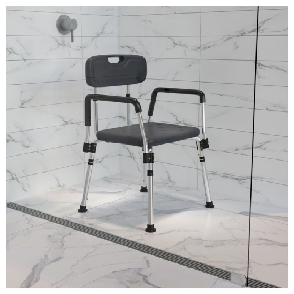 The Flash Furniture DC-HY3523L-GRY-GG Hercules Series Shower Chair is a versatile and essential addition to any bathroom, particularly for individuals seeking enhanced safety and comfort. With an adjustable height range of 28 to 33 inches, this shower chair caters to users with varying needs, making it suitable for diverse market segments, including seniors and individuals with mobility challenges. The chair's robust design supports up to 300 lbs., ensuring stability and confidence during use. Crafted with a durable aluminum frame, it combines strength with lightweight convenience for easy maneuverability. The gray plastic seat and back are designed for longevity and are complemented by drainage holes that prevent water accumulation, enhancing user safety. For added convenience, the chair features quick release back and arms, facilitating effortless assembly and disassembly without tools. Non-slip rubber feet provide additional security by preventing unwanted movement on wet surfaces. This product is FSA eligible, offering financial flexibility for customers using healthcare accounts. FDA approval underscores its commitment to safety standards, making it a reliable choice for those needing dependable support in the shower. The Flash Furniture Hercules Series Shower Chair stands out as an adaptable and practical solution for enhancing bathroom safety and independence.