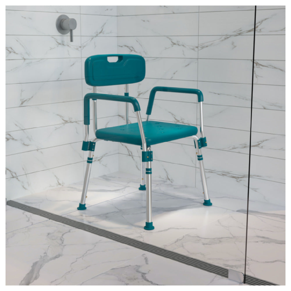 The Flash Furniture DC-HY3523L-TL-GG Hercules Series Shower Chair is designed for versatility and safety in personal care settings, offering an adjustable height range of 28 to 33 inches to accommodate users of varying heights. This chair supports up to 300 lbs and features a durable plastic seat and back, enhanced with a textured design and drainage holes for improved comfort and hygiene. The quick release back and arms provide convenience and adaptability, allowing for easy customization based on user needs. Constructed with a sturdy aluminum frame, this shower chair ensures stability and durability, while non-slip rubber feet promote additional safety by preventing movement on wet surfaces. The tool-free assembly design simplifies setup, making it accessible to a wide range of users. Furthermore, this product is FSA eligible, providing financial flexibility for consumers utilizing health savings accounts. The FDA approval highlights its compliance with safety standards, ensuring peace of mind for users in healthcare environments. Available in an attractive teal color, the Flash Furniture shower chair is a practical and stylish addition to any bathroom, catering to the needs of both home users and healthcare facilities seeking reliable and user-friendly bathing solutions.