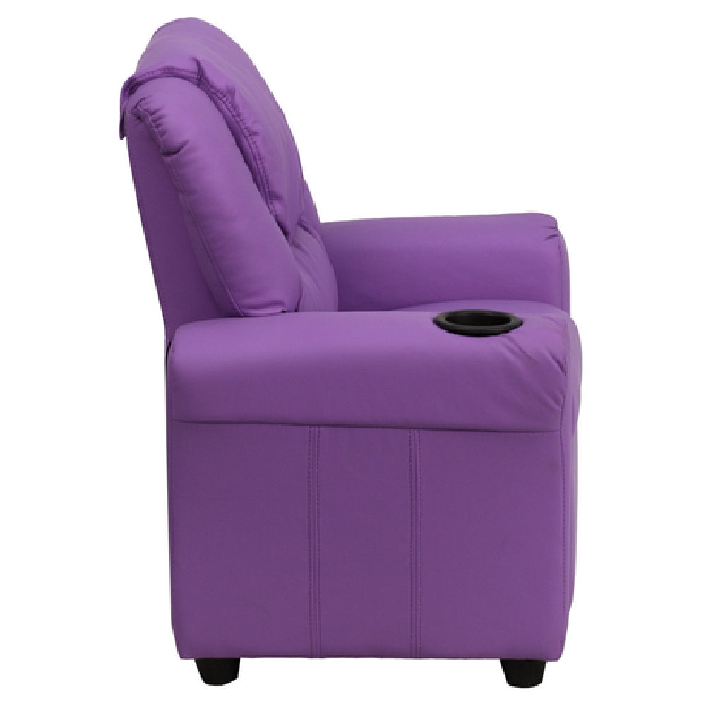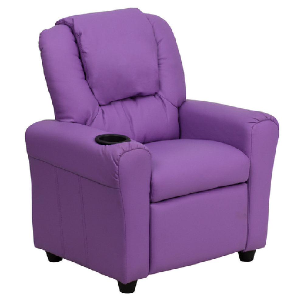 The Flash Furniture DG-ULT-KID-LAV-GG Kids' Recliner is a contemporary style seat designed specifically for children, providing comfort and functionality in a compact size of 24"W x 21-1/2"-36-1/2"D x 27"H. This recliner is thoughtfully constructed with plush padding and an oversized headrest cover to ensure maximum comfort for young users. It features an upholstered back and seat, complemented by armrests and a cup holder, making it an ideal choice for both relaxation and entertainment. The recliner's solid hardwood frame ensures durability, while the raised black plastic feet add stability and style. A key safety feature is that the recliner will not recline unless the child is seated and pulls the ottoman 1" out, adding a layer of protection. The use of CA117 fire retardant foam highlights its commitment to safety, while the lavender-colored vinyl upholstery adds a playful touch. With a weight limit of 90 lbs, this recliner is suitable for a range of children. Some assembly is required, and in-stock items typically ship within 24 hours, making it a convenient option for families seeking a stylish and safe seating solution for their children.