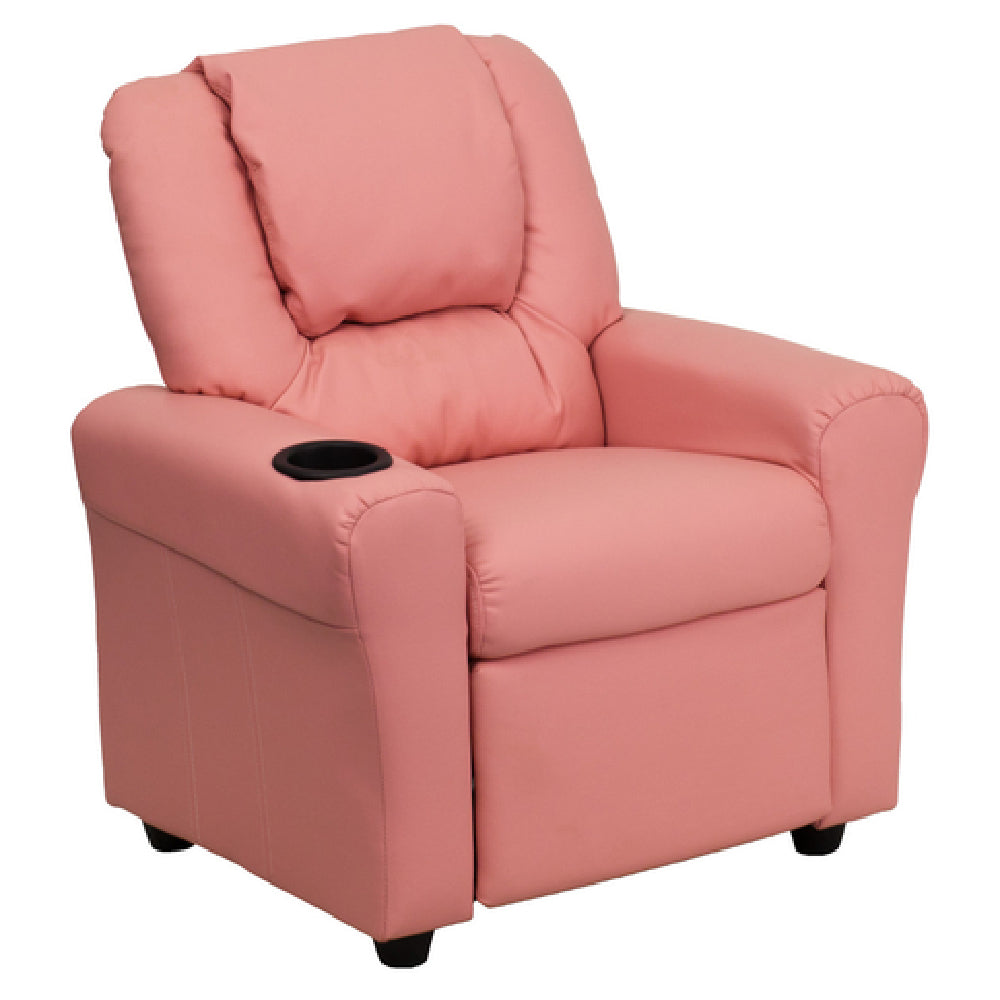 The Flash Furniture DG-ULT-KID-PINK-GG Kids' Recliner is a contemporary styled seating option designed with the comfort and safety of children in mind. Measuring 24"W x 21-1/2" - 36-1/2"D x 27"H, this recliner is perfectly sized for kids, providing plush padding and an oversized headrest cover for added comfort. The recliner is upholstered with vinyl and features a solid hardwood frame, offering durability and lasting use. It includes armrests and a convenient cup holder, making it a practical choice for relaxation. The recliner is supported by raised black plastic feet and has a weight limit of 90 lb, ensuring stability. A notable safety feature is its requirement for the child to be in a seated position and to pull the ottoman 1" out for reclining, enhancing its child-friendly design. Additionally, the recliner is constructed with CA117 fire retardant foam, emphasizing safety. Available in pink and requiring assembly, this recliner is typically in stock and ships within 24 hours, catering to quick needs. The Flash Furniture DG-ULT-KID-PINK-GG Kids' Recliner is an ideal choice for those seeking a safe, comfortable, and stylish seating solution for children.