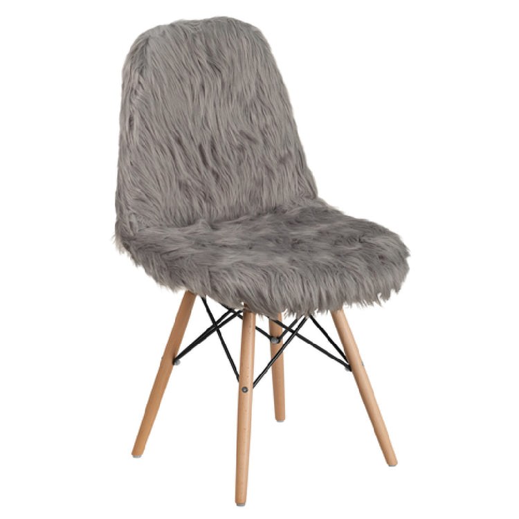 Flash Furniture DL-16-GG Accent Side Chair - The contemporary design of this chair is highlighted by its contoured shape and upholstered shaggy dog fur back and seat, providing a unique and stylish look. The chair is crafted with CA117 fire retardant foam, ensuring safety in various settings. Its base is constructed from wood, featuring metal bracing for enhanced stability and durability. Designed for commercial use, this chair is ideal for environments like waiting rooms, offices, and lounges where both aesthetics and functionality are important. The charcoal gray fabric adds a touch of elegance, making it a versatile addition to any modern decor. Additionally, the chair is equipped with plastic floor glides, protecting floors from scratches and allowing easy rearrangement. Its construction caters to the needs of hospitality and corporate settings, offering a sophisticated seating solution that combines comfort with contemporary style.