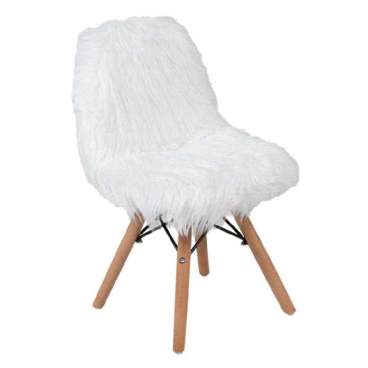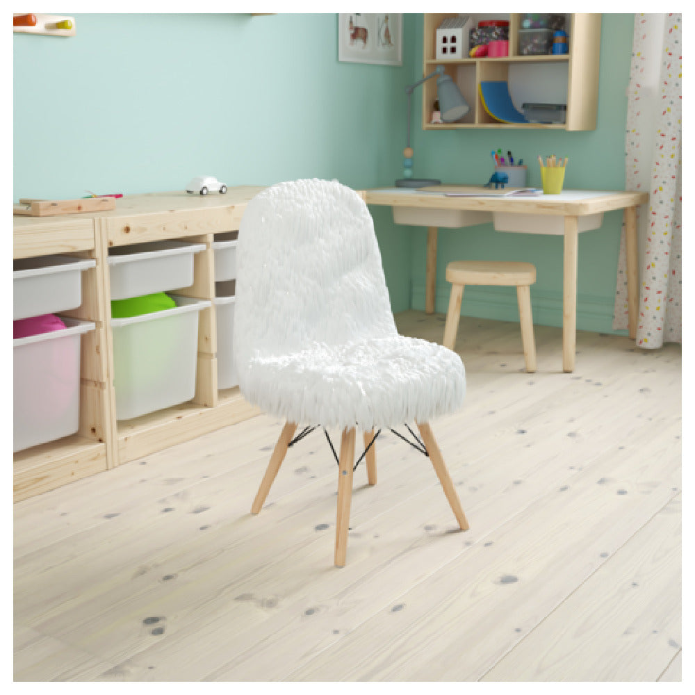 The Flash Furniture DL-DA2018-1-W-GG Cody Accent Side Chair is a meticulously designed piece, featuring shaggy upholstery and a padded seat for maximum comfort. This chair is specially crafted with CA117 fire retardant foam, ensuring both safety and durability. Its construction is supported by sturdy wooden legs that are reinforced with metal bracing, providing a robust foundation. For added practicality, the chair is equipped with floor protector plastic glides, which safeguard your flooring from scratches and damage. Specifically recommended for children aged 5 to 7, this chair is designed with their comfort and safety in mind. Its elegant white color makes it a versatile addition to any space, seamlessly blending with various interior decors. The Cody Accent Side Chair stands out in the market as a perfect blend of style, safety, and functionality, making it a valuable asset in homes, educational settings, or recreational environments where young children are present. Its thoughtful design and quality materials ensure it meets the diverse needs of its users, providing a seating solution that is both aesthetically pleasing and highly functional.