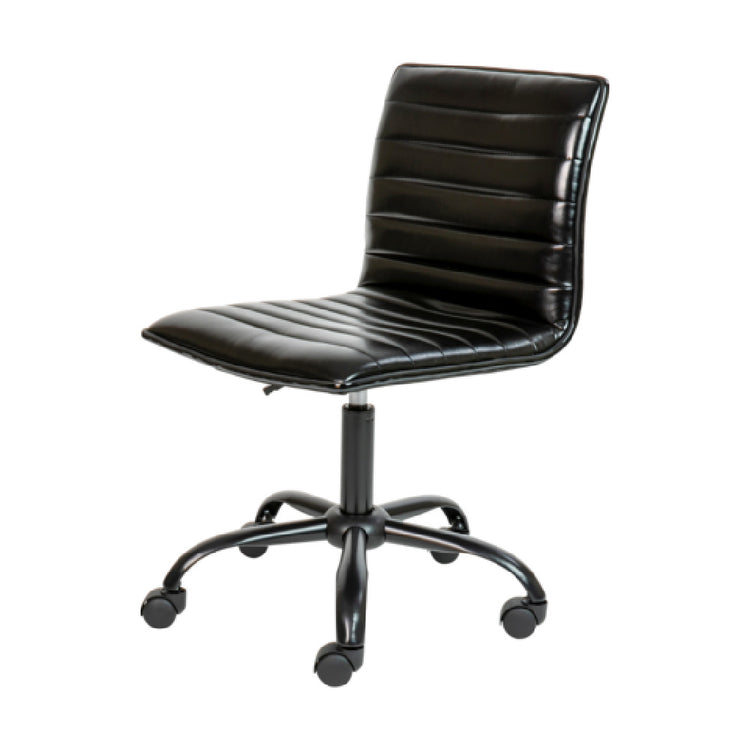 The Flash Furniture DS-512B-BK-BK-GG Alan Swivel Task Chair 31-1/4" to 36" Adjustable Height is a versatile seating solution designed for various professional settings. With its adjustable height range from 31-1/4 inches to 36 inches, this chair accommodates users of different heights to ensure ergonomic comfort. The chair supports a weight capacity of up to 250 pounds, making it suitable for a wide range of individuals. Featuring a low back design, the chair provides adequate support while maintaining a sleek profile, ideal for modern office environments. The ribbed vinyl upholstery offers a stylish and durable surface, while the foam-molded seat and back promise enhanced comfort over extended periods. Safety is addressed with CA117 fire retardant foam, meeting essential standards for fire safety in commercial settings. The pneumatic seat height adjustment allows for easy customization, while the chair's black frame and base provide a cohesive look. Equipped with dual wheel casters, this chair ensures smooth mobility across various floor surfaces. Assembly is required, but its straightforward design facilitates easy setup. The Flash Furniture Alan Swivel Task Chair is a practical choice for office spaces, home workstations, and other professional environments that demand both style and functionality.