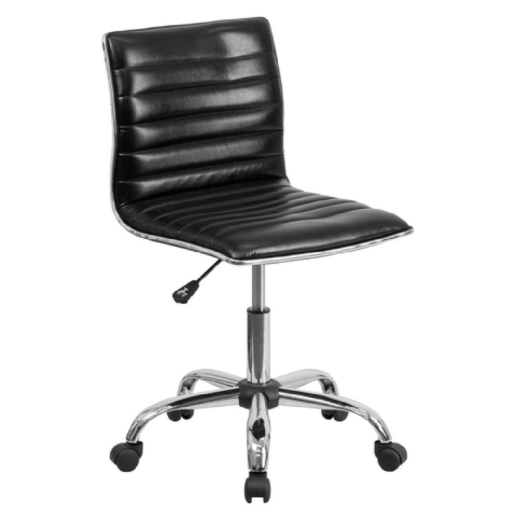 The Flash Furniture DS-512B-BK-GG Designer Swivel Task Chair 31-1/4" to 36" Adjustable Height is a versatile seating solution designed to cater to various market segments within the office and home workspace industry. With a weight capacity of 250 lb, this chair is crafted to accommodate a wide range of users. The low back design provides ergonomic support, making it suitable for both professional and casual settings. Featuring ribbed glossy vinyl upholstery, the chair exudes a modern aesthetic while ensuring durability. The foam molded seat and back offer comfort for extended periods of use, complemented by a stylish chrome border and base that enhances its visual appeal. Equipped with CA117 fire retardant foam, this chair adheres to safety standards, providing peace of mind in various environments. The dual wheel casters enable smooth mobility, making it easy to maneuver across different floor types. Assembly is required, and in-stock items typically ship within 24 hours. This chair's adjustable height, ranging from 31-1/4" to 36", allows users to customize their seating position for optimal comfort. The Flash Furniture Designer Swivel Task Chair is a practical and stylish choice for those seeking functionality and contemporary design in their workspace furniture.