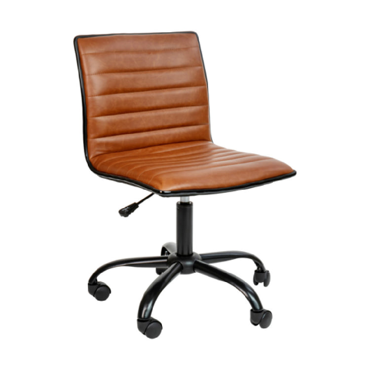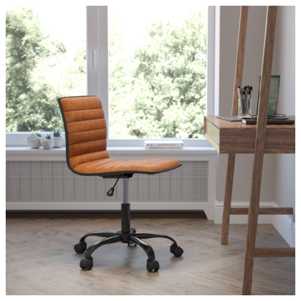 The Flash Furniture DS-512B-BR-BK-GG Alan Swivel Task Chair is a versatile seating solution designed for various office and home environments. With an adjustable height ranging from 31-1/4 inches to 36 inches, it accommodates users of different statures, providing personalized comfort. The chair supports a weight capacity of up to 250 pounds, ensuring durability and stability for a wide range of users. Its low back design, complemented by ribbed vinyl upholstery, adds a touch of modern style while maintaining support. The foam molded seat and back, featuring CA117 fire retardant foam, offer additional safety and comfort. The chair is equipped with a pneumatic seat height adjustment mechanism, allowing seamless transitions between different heights. The black frame and base provide a sleek aesthetic, while dual wheel casters enhance mobility across various surfaces. Available in brown, this task chair requires assembly, making it a practical choice for those seeking an efficient and stylish seating option. Its combination of features makes it suitable for both professional office settings and home workspaces, emphasizing functionality and design.