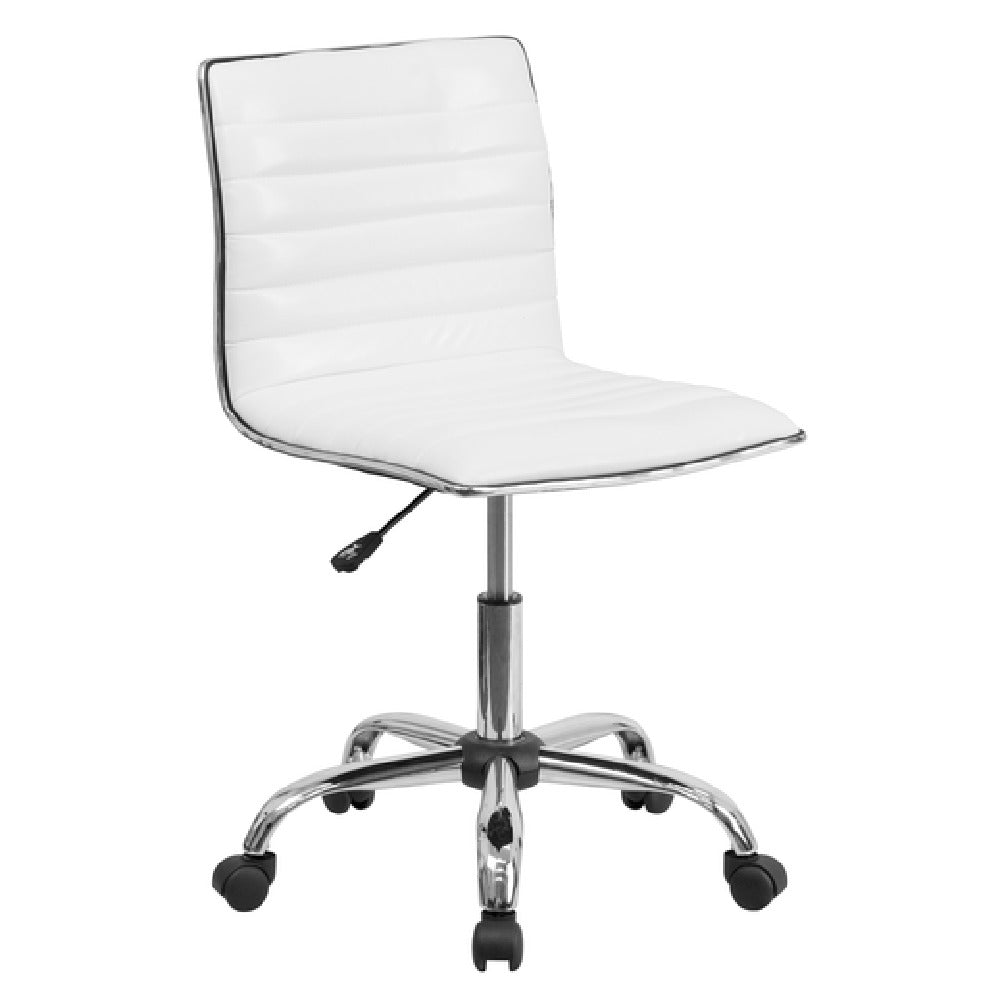 Flash Furniture DS-512B-WH-GG Designer Swivel Task Chair 31-1/4" To 36" Adjustable Height - This chair combines functionality and style, making it a versatile choice for various professional settings. It features an adjustable height range from 31-1/4 inches to 36 inches, allowing users to customize it to their preference for enhanced comfort. The chair supports a weight capacity of up to 250 pounds, providing robust durability. Its low back design is paired with ribbed glossy vinyl upholstery, offering a contemporary aesthetic that complements modern office spaces. The foam-molded seat and back provide ergonomic support, ensuring comfort during long hours of use. Encased in a chrome border, the chair presents a sleek finish, while the chrome base adds to its sturdiness. Equipped with dual wheel casters, it offers easy mobility across various floor types. The chair is designed with CA117 fire retardant foam, emphasizing safety alongside comfort. Suitable for different segments like home offices, corporate workspaces, or creative studios, this chair balances style with practical features. Assembly is required upon purchase, and in-stock items are typically shipped within 24 hours, ensuring prompt delivery for immediate use.