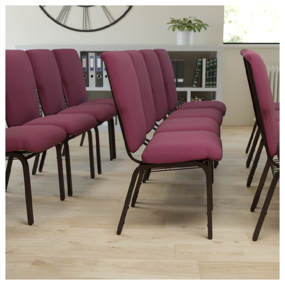 The Flash Furniture EPCHT-100 Church Chair Stacking 21"W is a versatile seating solution designed to meet the needs of diverse environments, from places of worship to conference centers. This chair features a generous 21-inch width, providing ample space for comfort during extended periods of use. The chair is constructed with a stacking design, allowing for efficient storage and easy transport, making it a practical choice for venues that require flexible seating arrangements. The upholstered back and seat offer a sophisticated look and a comfortable seating experience, ideal for maintaining attention during long ceremonies or presentations. The rich burgundy color adds a touch of elegance, enhancing the aesthetic appeal of any setting. This combination of functionality and style makes the Flash Furniture EPCHT-100 Church Chair an excellent choice for institutions looking for durable and attractive seating options. Whether for regular attendees or special events, this chair’s design caters to high-capacity venues without compromising on comfort or style.