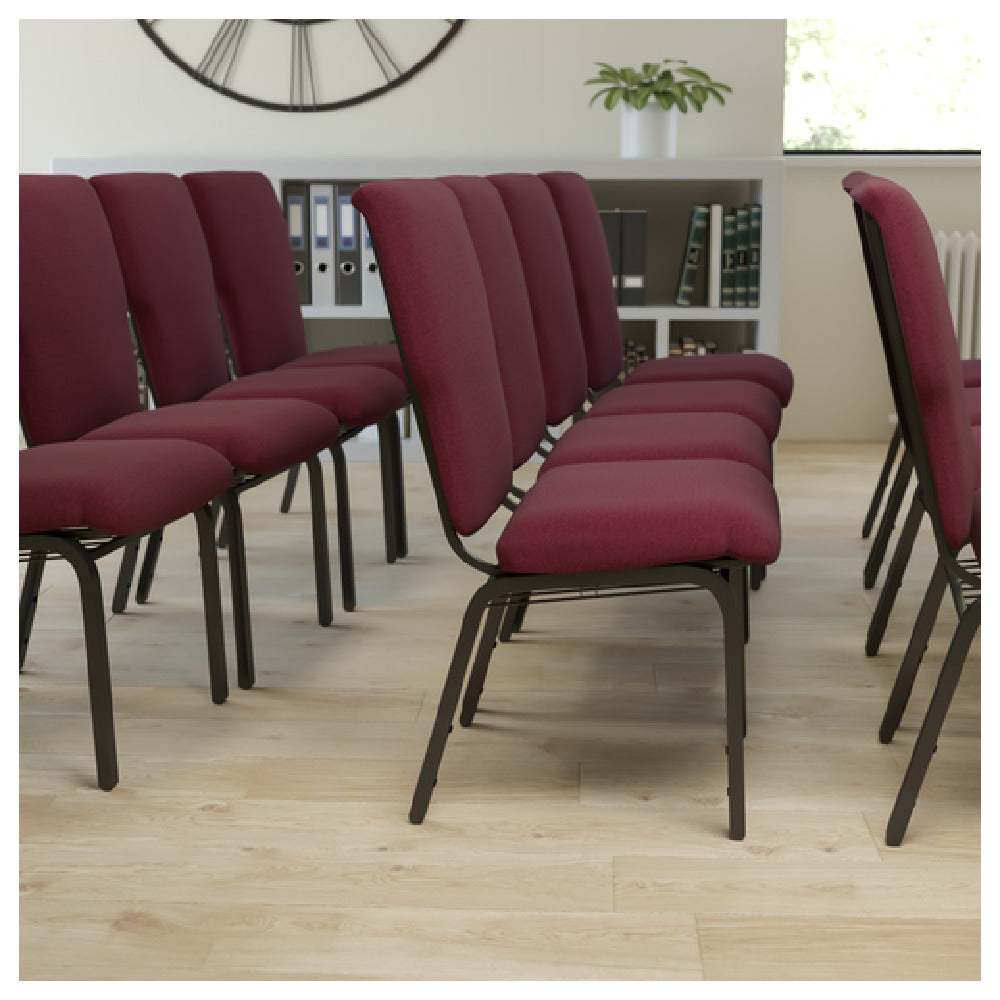 The Flash Furniture EPCHT-104 Church Chair Stacking 21"W is a meticulously designed seating solution that combines comfort and practicality for various institutional settings. This chair features a 21-inch wide upholstered back and seat, providing ample space and a plush seating experience. The rich maroon color adds a touch of elegance and warmth, making it suitable for any church setting or community gathering space. Its stacking capability allows for efficient storage, making it an excellent choice for venues that require flexibility and ease of arrangement, such as churches, conference halls, and event centers. The chair's design emphasizes durability and ease of maintenance, catering to the high-traffic environments these chairs are often placed in. The Flash Furniture EPCHT-104 Church Chair is engineered to meet the needs of diverse market segments by offering a reliable, stylish, and space-saving seating option. Its robust construction ensures a long lifespan, providing excellent value for facilities looking to invest in high-quality furniture. This chair is a testament to thoughtful design and functionality, perfectly suited for enhancing the comfort and aesthetics of any institutional space.