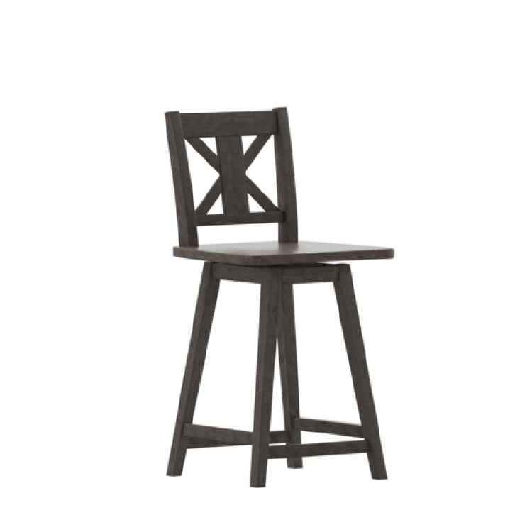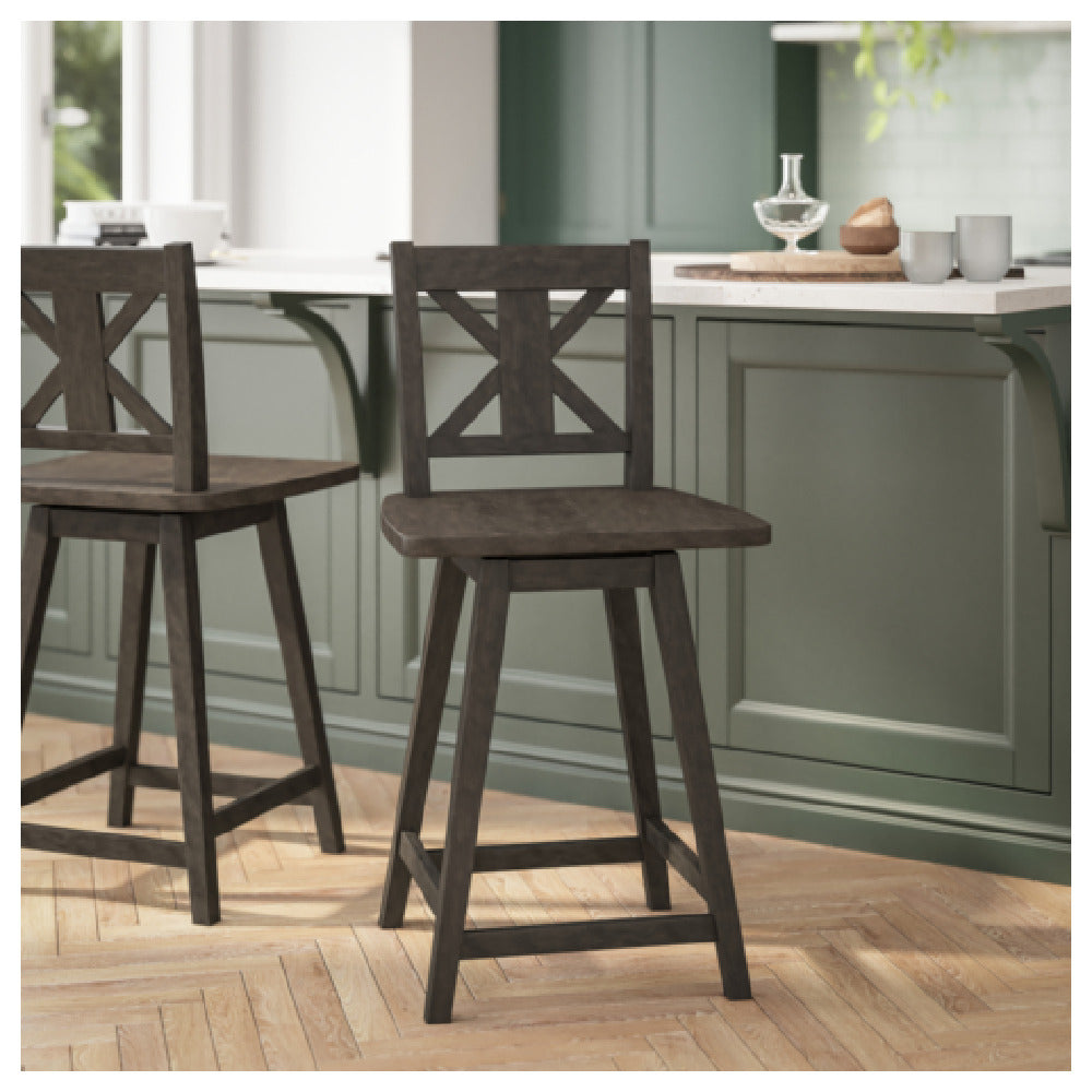 The Flash Furniture ES-G1-24-GY-GG Gwendolyn Modern Farmhouse Swivel Counter Height Bar Stool is a versatile seating solution designed to seamlessly blend with modern and traditional décor. This bar stool features a supportive cross-back design that not only adds a touch of elegance but also enhances comfort. It is crafted from solid wood, ensuring durability and longevity, while the gray wash walnut finish offers a sophisticated and rustic appeal. The stool is engineered to support up to 225 pounds, making it suitable for a wide range of users. The inclusion of a footrest provides additional comfort, particularly during extended use. The swivel functionality allows for easy movement and accessibility, making it ideal for social settings such as kitchen islands, home bars, and dining counters. This product caters to diverse segment markets by offering a combination of aesthetic appeal and functional design, meeting the needs of both residential and commercial environments. The Flash Furniture ES-G1-24-GY-GG Gwendolyn Modern Farmhouse Swivel Counter Height Bar Stool stands out as a practical and stylish choice for those seeking a blend of modern farmhouse charm and superior craftsmanship.