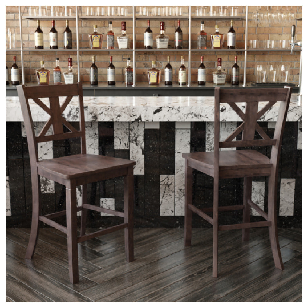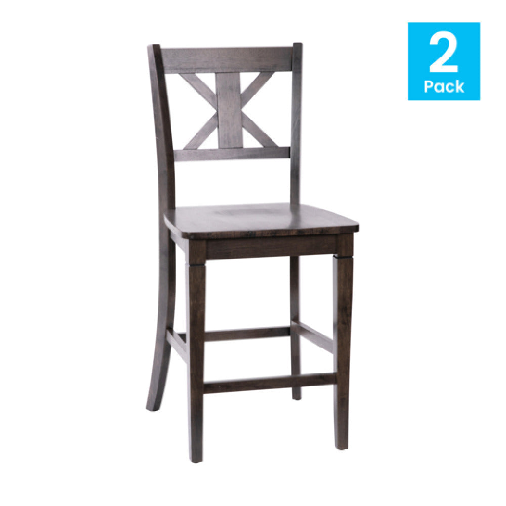 The Flash Furniture ES-STBN1-24-GY-2-GG Gwendolyn Bar Stool Counter Height 225 Lb. Weight Capacity stands out with its distinctive blend of style and functionality, tailored to meet the needs of diverse market segments. This bar stool is designed with a cross-back design and integrated footrests, providing both comfort and aesthetic appeal. The solid hardwood frames ensure durability, making it a reliable choice for both residential and commercial settings. Featuring a sophisticated gray wash walnut finish, it complements a variety of interior décors. The counter height design is ideal for kitchen islands, bars, and counters, offering versatility in its application. Each set includes two stools, requiring assembly, which allows for customizable placement in different settings. With a robust weight capacity of 225 pounds, it accommodates a wide range of users, enhancing its utility in various environments. The Gwendolyn Bar Stool is a testament to quality craftsmanship and thoughtful design, making it a practical and stylish addition to any space where counter-height seating is needed.
