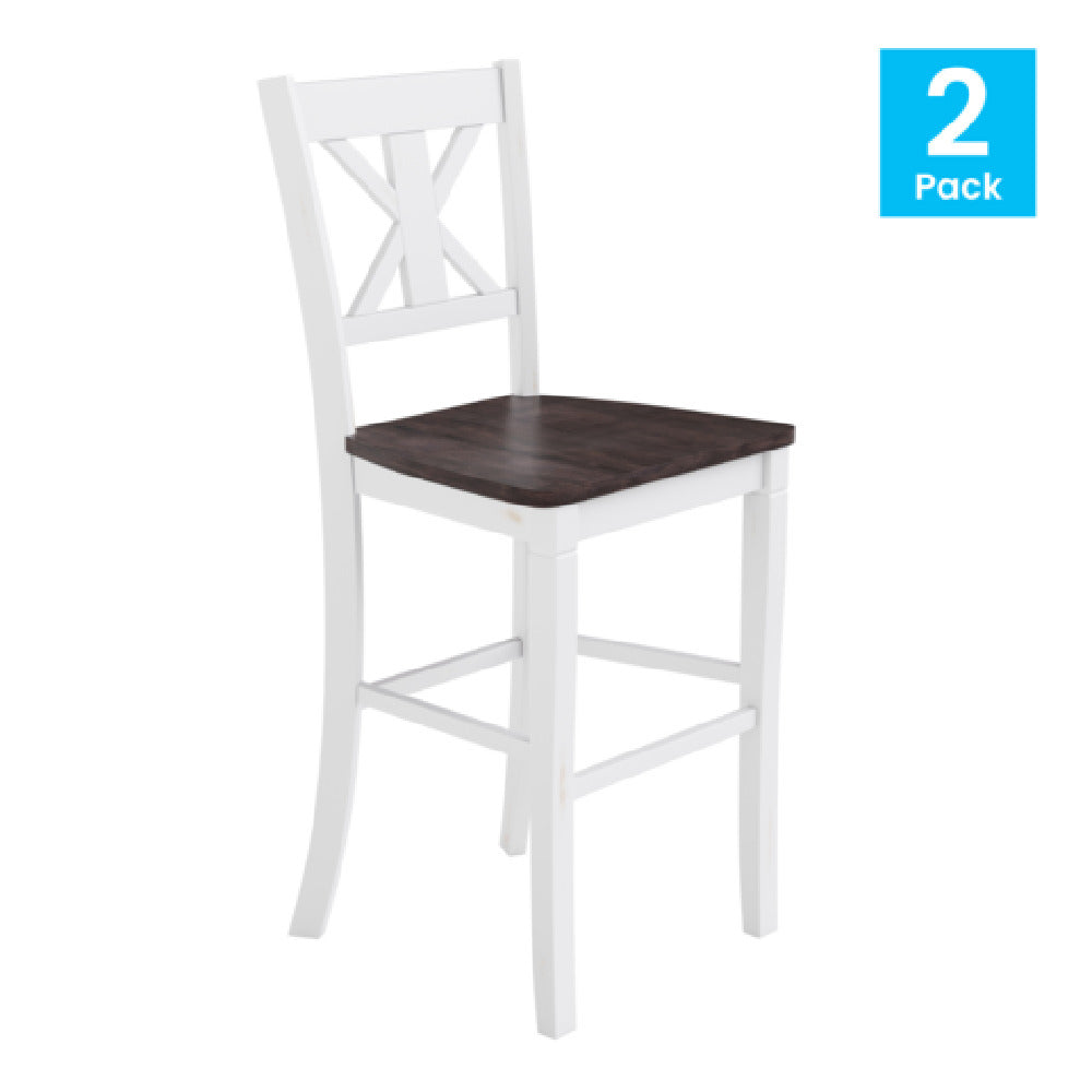 The Flash Furniture ES-STBN1-29-WH-2-GG Gwendolyn Bar Stool is a meticulously crafted seating option that combines style and functionality, designed to meet the diverse needs of different market segments. This bar stool is presented in a set of two, featuring a robust bar height structure capable of supporting up to 225 lb. Constructed with solid hardwood frames, the stools promise durability and stability, making them a reliable choice for both residential and commercial environments. The cross back design not only enhances the aesthetic appeal but also provides ergonomic support, ensuring comfort during extended periods of use. Incorporated into the design are integrated footrests, further enhancing user comfort. The antique white wash finish offers a timeless look that can seamlessly integrate into various decor styles, from rustic to contemporary. This product does require assembly, allowing for convenient shipping and handling. With these features, the Flash Furniture ES-STBN1-29-WH-2-GG Gwendolyn Bar Stool is an ideal seating solution for bars, kitchens, and high dining areas, where both appearance and functionality are paramount. Whether for a home breakfast bar or a bustling restaurant setting, these stools are designed to meet high standards of practicality and visual appeal.