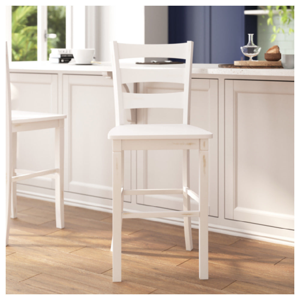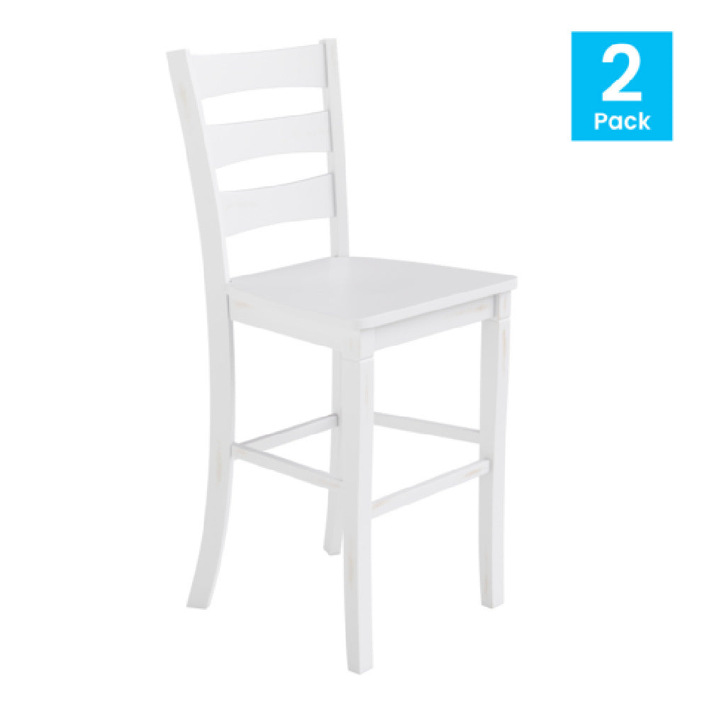 The Flash Furniture ES-STBN5-29-WH-2-GG Liesel Bar Stool is a sophisticated seating solution, specifically designed to cater to a variety of market segments within the hospitality and home furnishing industries. This bar stool is a bar height model with a weight capacity of 225 lbs, ensuring both comfort and stability for its users. It features a distinctive ladder back design, providing both aesthetic appeal and support. The integrated footrests add an extra layer of comfort, making it ideal for long periods of sitting. Constructed from solid hardwood frames, this stool guarantees durability and long-term use. The antique white wash finish gives it a vintage charm, making it a versatile addition to both modern and classic interiors. This product is sold as a set of two, making it a convenient choice for those looking to furnish larger areas. Please note that assembly is required upon purchase. The Flash Furniture ES-STBN5-29-WH-2-GG Liesel Bar Stool is an excellent choice for bars, restaurants, and residential settings, offering a blend of style, support, and functionality.