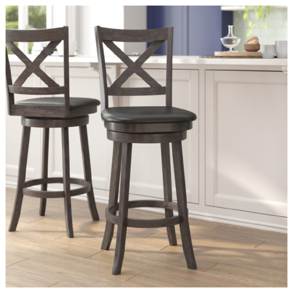 The Flash Furniture ES-UN1-29-GY-GG Felicity Swivel Barstool is a meticulously designed seating solution that blends style and functionality, ideally suited for both residential and commercial environments. This barstool features a distinctive crossback design, enhancing its aesthetic appeal while providing sturdy support. The seat is padded with LeatherSoft, a blend of leather and polyurethane, ensuring a soft yet durable seating experience. With a weight capacity of 300 lbs, this barstool accommodates a wide range of users, making it a versatile choice for various settings. The wood frame, finished in a gray wash walnut, adds a touch of elegance and complements a variety of interior decor styles. The swivel functionality offers ease of movement, making it an excellent choice for social settings where interaction is key. Whether used in a home kitchen, bar, or restaurant, the Flash Furniture Felicity Swivel Barstool stands out as a reliable and stylish seating option, with its combination of comfort, durability, and modern design. Its technical specifications, including a robust weight capacity and high-quality materials, make it a valuable addition to any high-traffic area requiring versatile and reliable seating solutions.