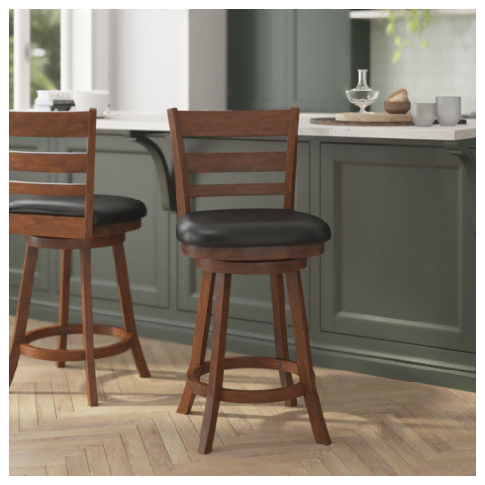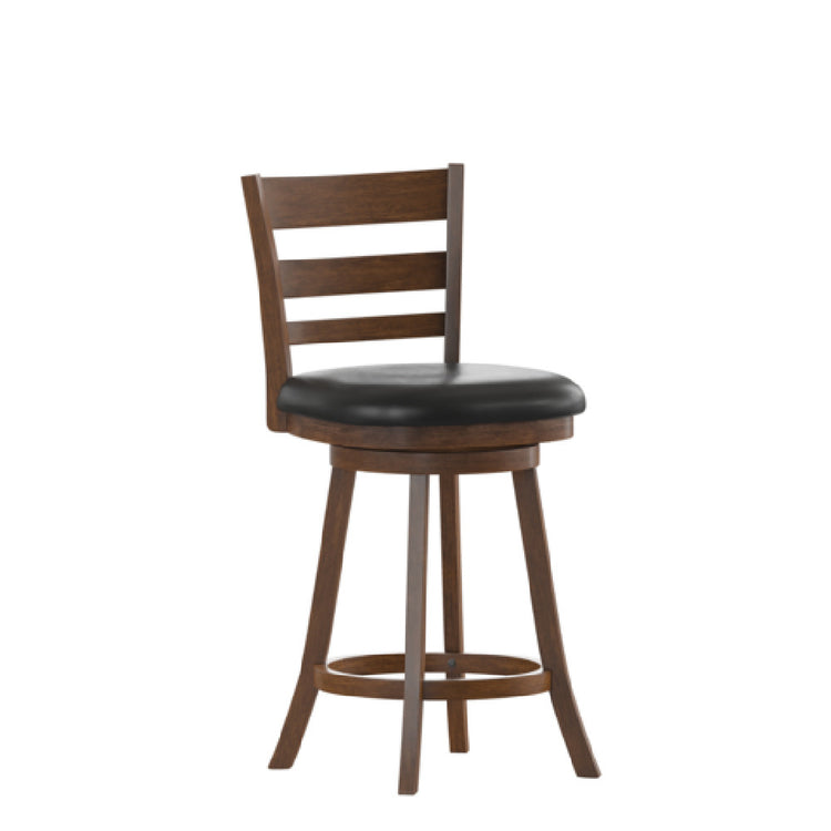 The Flash Furniture ES-UN3-24-OAK-GG Zerrick Swivel Counter Height Bar Stool stands out with its elegant design and functional features, making it a versatile addition to various settings such as home kitchens, bars, and dining areas. This stool is meticulously crafted with a wood ladderback, offering a classic aesthetic that complements its antique oak finish. The padded LeatherSoft seat enhances comfort, combining durability with luxury due to its high-quality black upholstery. The swivel functionality of the stool ensures ease of movement, catering to a dynamic seating experience. With its counter height design, this stool is perfectly suited for use at kitchen islands and high tables, making it a fitting choice for both residential and commercial environments. The sturdy construction of the ES-UN3-24-OAK-GG ensures longevity, while its stylish appearance adds a touch of sophistication to any space. Its unique combination of materials and finishes provides both aesthetic appeal and practical use, appealing to consumers seeking a blend of traditional and contemporary design elements. The Zerrick Swivel Counter Height Bar Stool is an exemplary piece that meets the needs of diverse market segments, from homeowners to business owners in the hospitality industry.