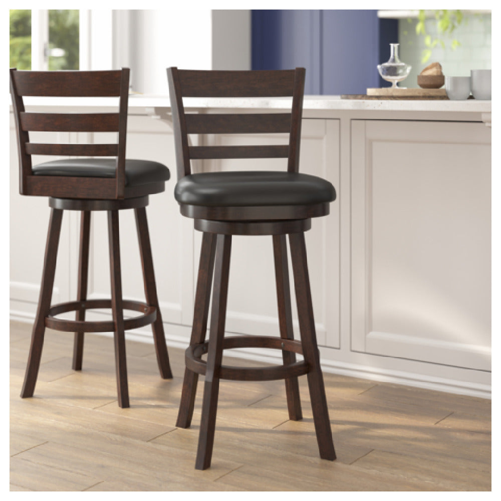 The Flash Furniture ES-UN3-29-ESP-GG Zerrick Swivel Bar Stool is a sophisticated seating solution designed for both residential and commercial spaces. This bar stool features a classic wood ladderback design that enhances its aesthetic appeal, making it an ideal choice for a variety of environments, from home kitchens to upscale bars and restaurants. The stool's solid construction is complemented by its espresso finish, which adds a touch of elegance and warmth to any setting. The padded LeatherSoft seat provides exceptional comfort, combining durability with a luxurious feel that is inviting for extended seating periods. The black upholstery further highlights the stool’s refined look while offering easy maintenance. Its swivel functionality allows for a full 360-degree rotation, offering convenience and ease of movement in tight spaces. The Zerrick Swivel Bar Stool’s design and features make it a versatile choice for any venue looking to combine style, comfort, and functionality.