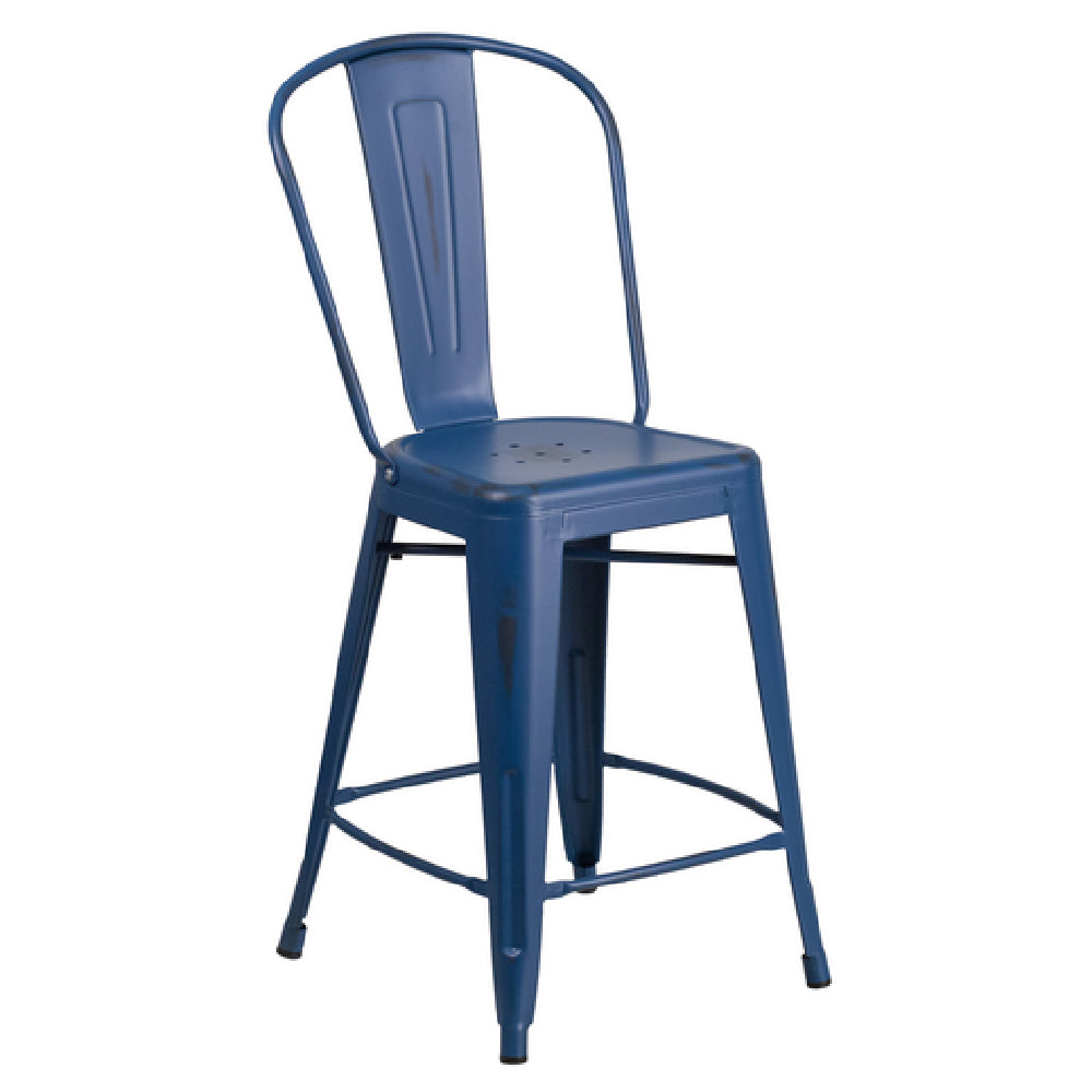 The Flash Furniture ET-3534-24-AB-GG Bar Stool is a robust seating solution with a substantial weight capacity of 500 lb, designed to cater to diverse market segments, particularly in commercial and residential settings. Its counter height construction and curved back with a vertical slat offer both comfort and style, while the inclusion of drain holes in the seat enhances practicality, especially for outdoor use. The stool is reinforced with a cross brace under the seat, ensuring structural integrity and durability. Crafted from galvanized steel, it boasts a distressed powder coat finish in Antique Blue, adding a touch of vintage appeal. This stool features a footrest for enhanced comfort and rubber floor glides to protect flooring surfaces. With its lightweight design, it is easy to maneuver, making it suitable for both indoor and outdoor environments. The Flash Furniture ET-3534-24-AB-GG is an ideal choice for those seeking a reliable and aesthetically pleasing seating option that ships within 24 hours for items in stock.