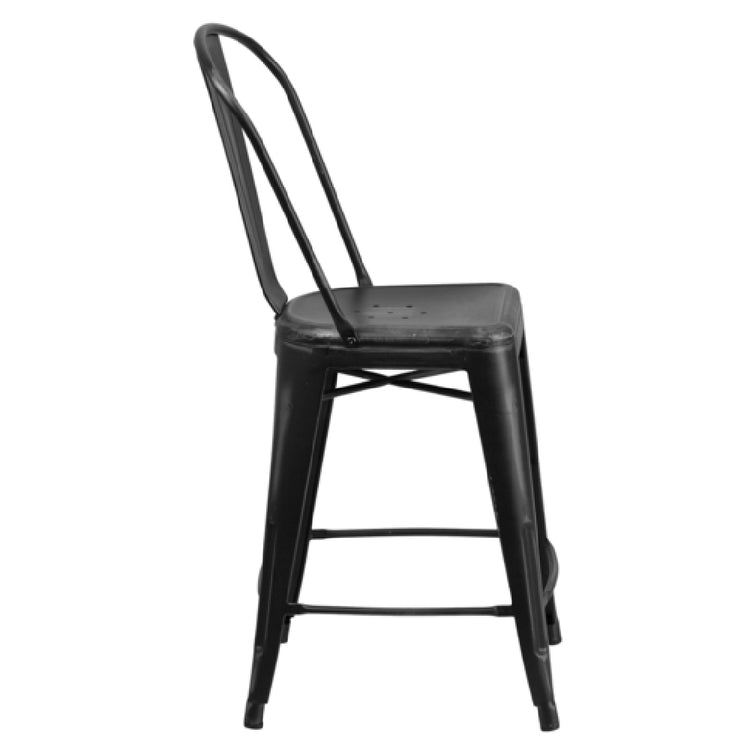 The Flash Furniture ET-3534-24-BK-GG Bar Stool is a versatile seating solution engineered to support up to 500 pounds, suitable for various commercial and residential environments. This bar stool is counter height, making it ideal for both bar and kitchen counter settings. Its design features a curved back with a vertical slat, providing comfort and support, while the seat includes drain holes, making it suitable for both indoor and outdoor use. Constructed from galvanized steel, the stool boasts a distressed powder coat finish that enhances its durability and aesthetic appeal. A cross brace under the seat ensures additional strength and stability. The stool is equipped with a footrest for added comfort and rubber floor glides to protect flooring surfaces. Lightweight in nature, it is easily maneuvered, adding convenience for dynamic spaces. This bar stool is ideal for a range of settings, from bustling cafes and restaurants to cozy home kitchens and patios. Available in black, the stool is typically ready for shipment within 24 hours, ensuring swift availability for urgent requirements. Its combination of robust construction and thoughtful design elements makes it a reliable choice for diverse seating needs.