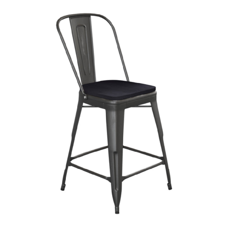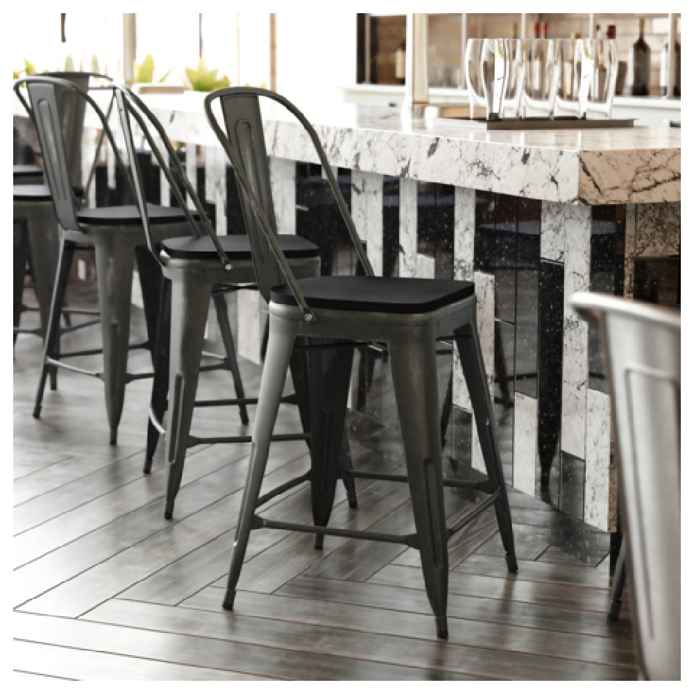 The Flash Furniture ET-3534-24-BK-PL1B-GG Carly Bar Stool 500 Lb. Weight Capacity is an exceptional piece crafted to meet the needs of diverse environments, from chic kitchens to bustling cafes. This bar stool boasts a robust 500-pound weight capacity, ensuring durability and reliability for various users. Designed at counter height, it features a curved back with a vertical slat, providing ergonomic support and comfort. The poly resin seat offers a blend of resilience and easy maintenance, while the distressed steel frame enhances its industrial aesthetic. A strategically placed cross brace under the seat adds to its structural integrity, making it a dependable choice for both indoor and outdoor settings. The inclusion of a footrest provides additional comfort, and floor glides ensure smooth movement and protection for flooring surfaces. Assembly is required, allowing for a personalized setup suited to specific needs. The black finish adds a sleek, modern touch, making it versatile for a range of decors. This bar stool is a practical and stylish seating solution that combines functionality with an appealing design, catering to both residential and commercial spaces.